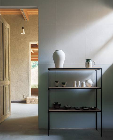 △家里的小艺廊空间。墙上贴着京都产的黑谷和纸,架子是用古材和铁制的,上面展示着两人的器作品。