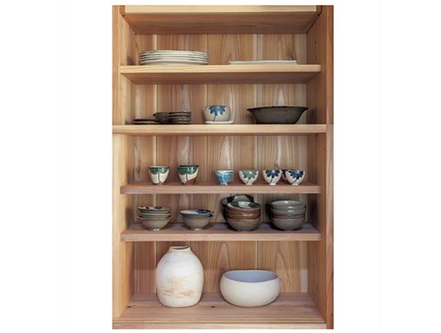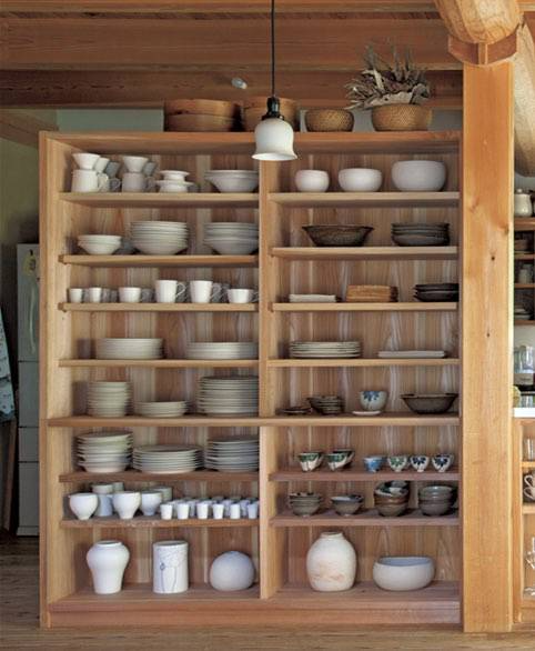 另一边的大型食器架同样是那位木工师傅的原创,虽然用的是很朴实的传统工艺,却也不是和风。它看起来简单舒服,和大谷夫妇的生活方式很相配。架子上整齐地摆放着夫妇俩的陶器作品,左边是大谷哲也的、右边是桃子的。