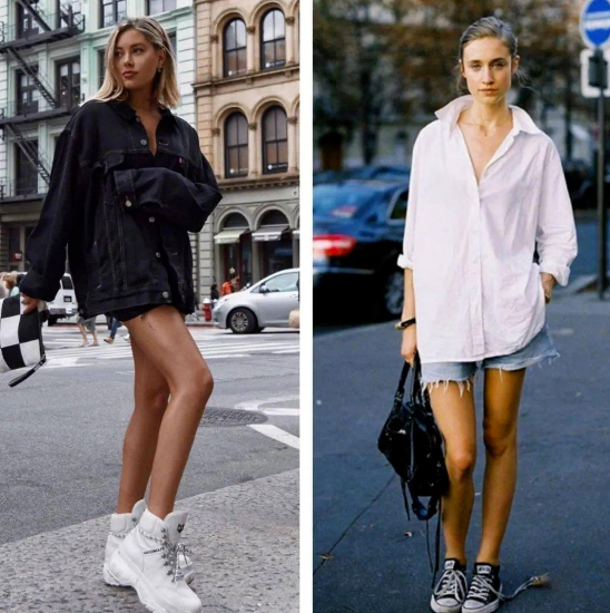 我们还可以了利用宽松上衣较长的衣摆遮挡住宽臀,达到显瘦的作用。