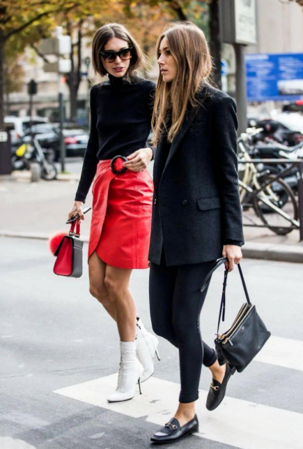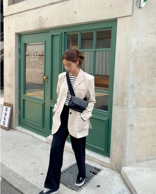 像下图这样,采用黑色西装搭配黑色打底裤的穿搭,因为黑色本身就很显瘦,再利用上下身同色的色彩拉伸感打造出一体感,模糊臀部线条,达到显瘦的效果。