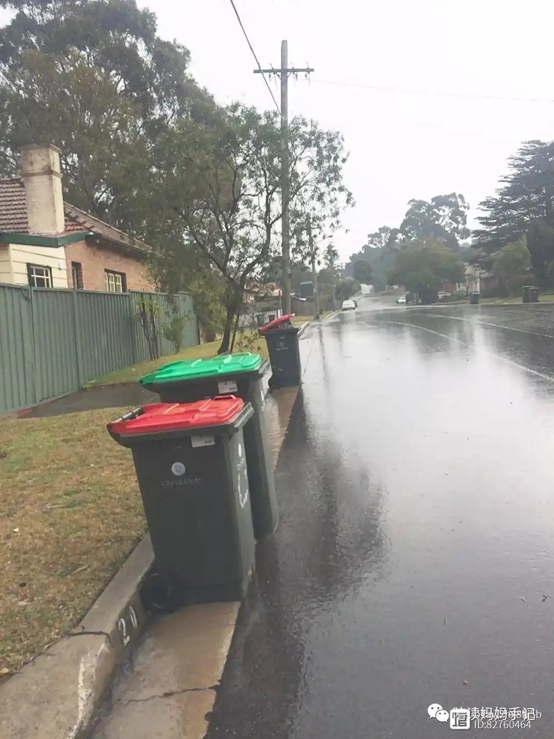垃圾桶有三种颜色,红黄绿,红色装不可回收的垃圾,绿色装树枝植物,黄色装塑料纸张等可回收垃圾(有的区还多一种蓝色,塑料玻璃瓶和纸张分开)。红色每周清运,黄色和绿色都是两周清一次。头天晚上桶口朝外摆在路边,第二天很早垃圾车就清走了。