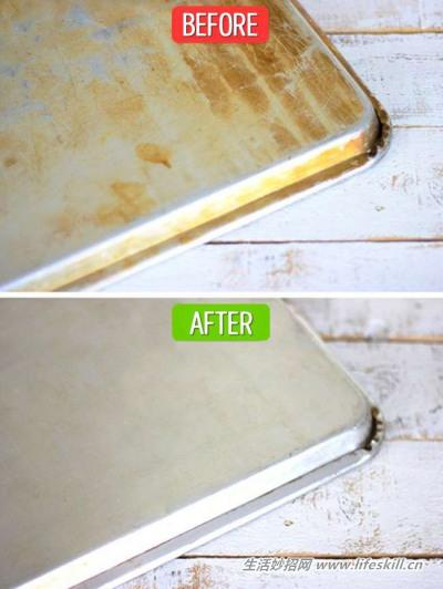 烤盘上面一定会有烤焦的油脂,将双氧水与小苏打粉加在一起变成糊状的混合物后,覆盖在烤盘脏污的地方,约等待20-30分钟后清洗干净,就可以把原本泛黄的烤盘恢复光洁!