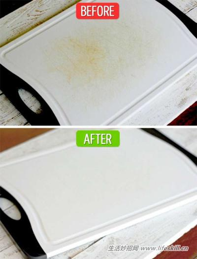 只要用海绵沾柠檬汁加盐巴,就可以把旧砧板恢复成全新的样子。