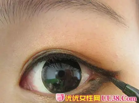 步骤七:用眼线笔蘸取眼线膏然后沿着上睫毛的根部画出一条细线,并且向上微微延长,在下眼角后三分之一的位置上同样画出一条眼线。#p#副标题#e#