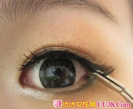 步骤九:为了让妆容不突兀,下假睫毛也要贴上。这样眼妆整体就完成了,迷人大眼妆立刻呈现。#p#副标题#e#
