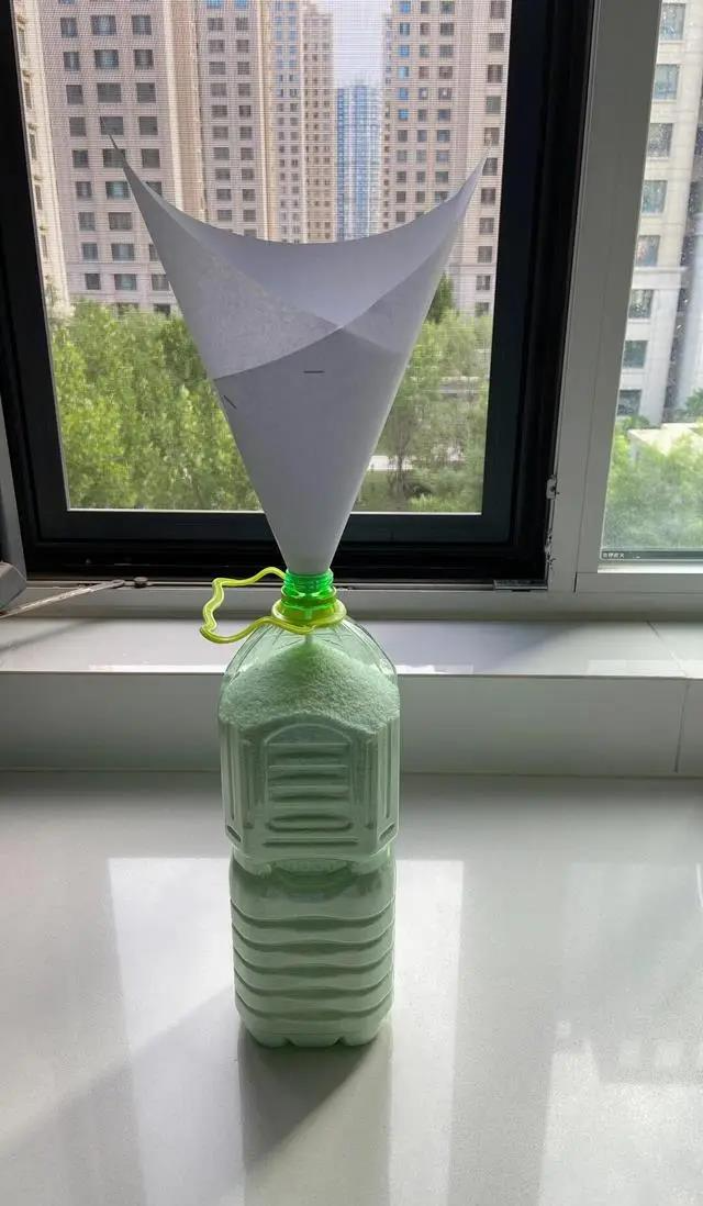 把2.5L的饮料瓶斜切45°,瓶口当勺柄,瓶身当勺斗,再配一个“定量翻盖”,每掀一次刚好25g,机器洗、手洗不纠结。