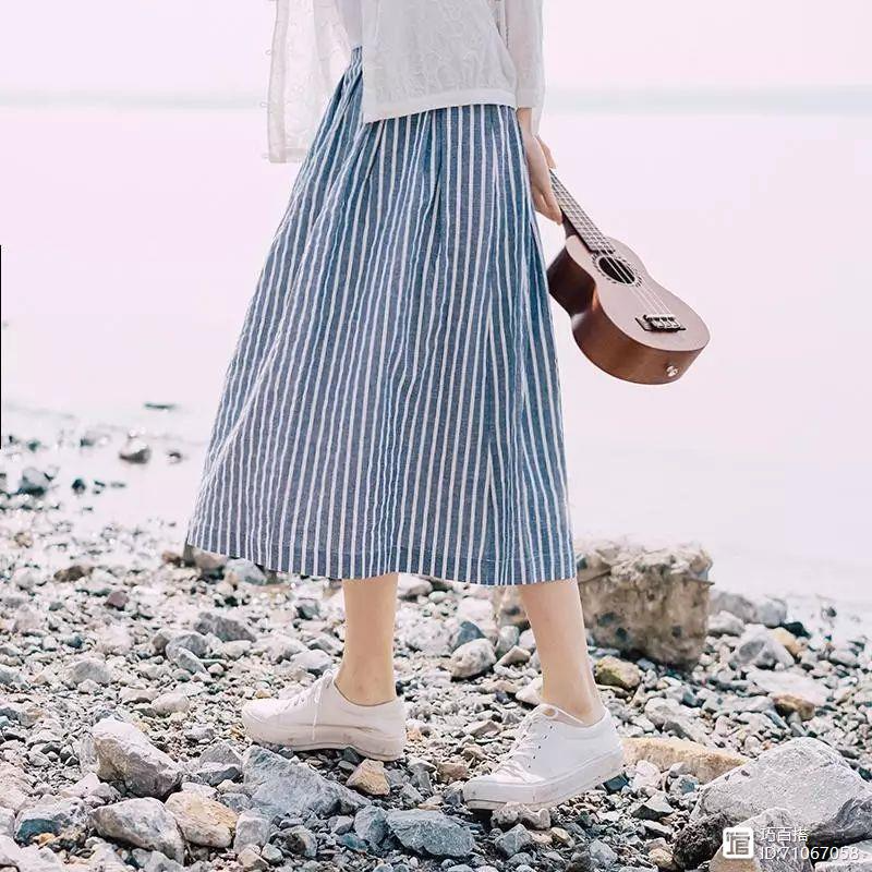 蓝白条纹的半身裙,复古蓬松的大摆,看上去给人一种清新文艺的风范儿。重要的身侧有着木扣的装饰,简单别致不失学院风。上身后遮肉显瘦还减龄。