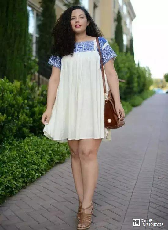 这一位你能发现她是一位胖美人吗?一身宽松裙装的她,把自身的肉肉完全掩藏,露出的纤细的手臂与小腿,反衬的身材瞬间显瘦不少呢。四肢纤细的妹纸可以尝试一下这种穿法呢。