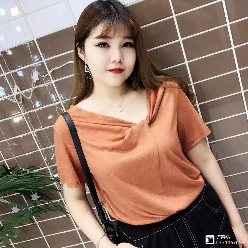 当然夏天感觉黑白搭不够出众,可以选择一款有着强烈视觉感的亮色。款式的话就选择简约款的,就比如这种领口左拧的T恤,简约不失亮点,看上去时尚又出众,搭配上一款黑色的半裙就OK了。