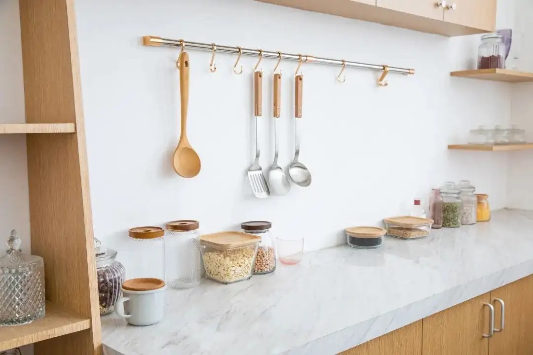 例如切菜的刀具,拌菜的筷子等,我们可以在灶台附近的墙面,统一收纳放置这些备菜工具,为厨房创造有效可利用的空间。