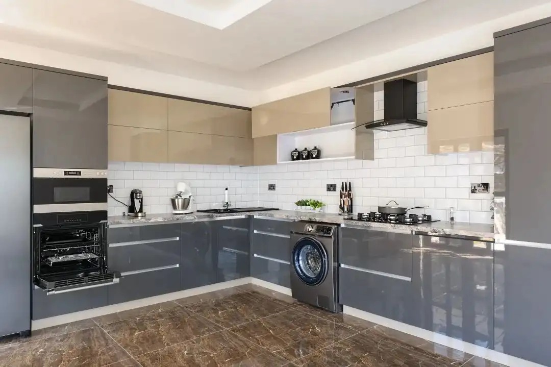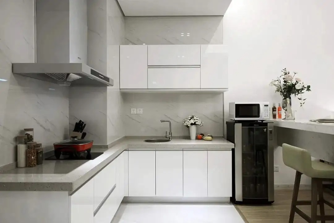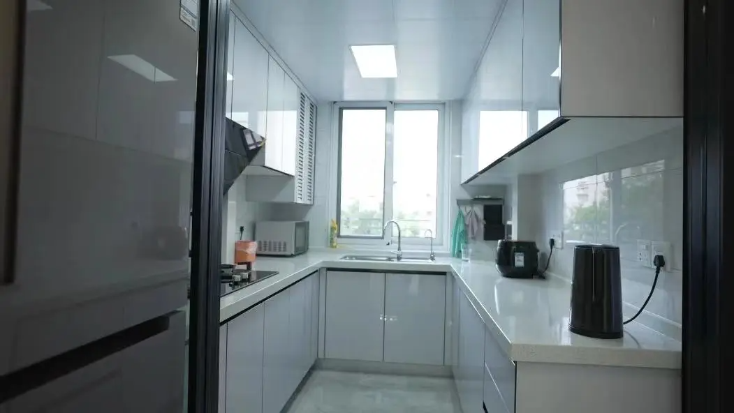同时,U型橱柜从设计来讲,空间增大,能够将配膳和烹饪分开设计,适合成员多、收纳需求大的家庭。