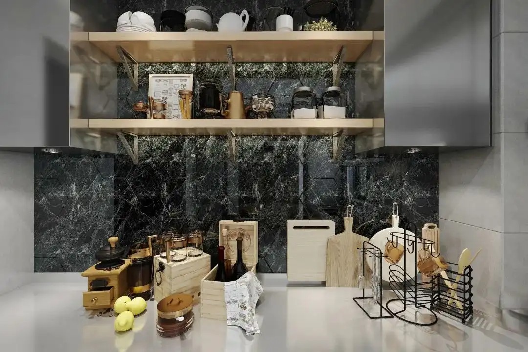 不仅实用性强,颜值也高,既可以用来收纳调料、五谷杂粮等常用物品,又可以存放高脚杯和装饰品,给厨房增添高级感。
