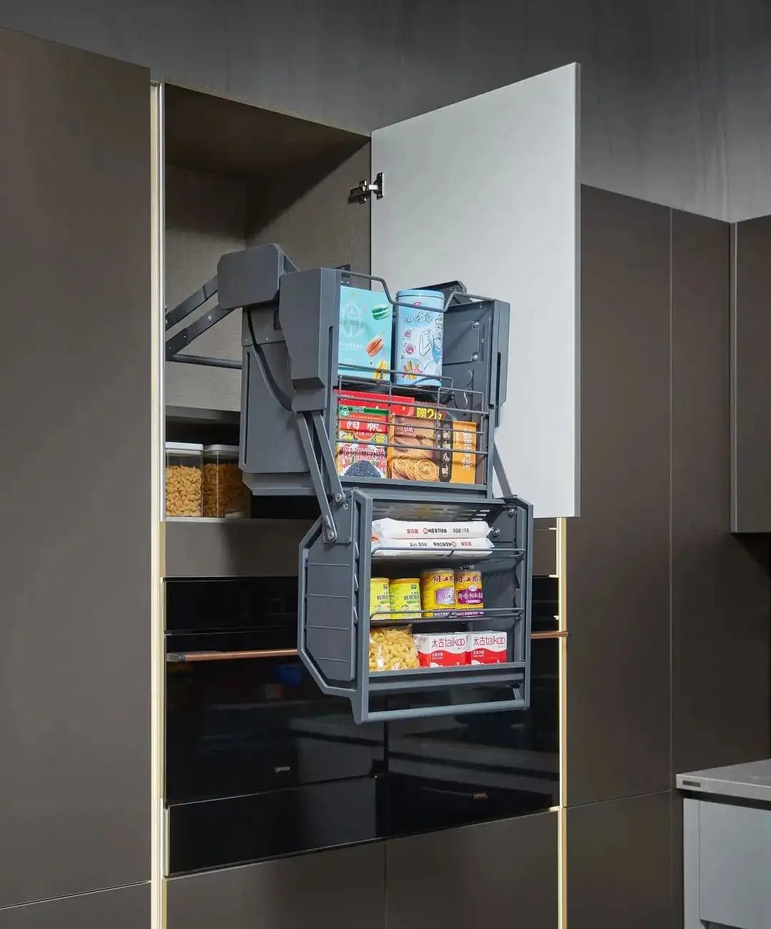 不仅化解了物品表面受长期油烟熏制、潮湿变质的问题,而且轻松解决了吊柜深度空间处不易拿取的困扰。