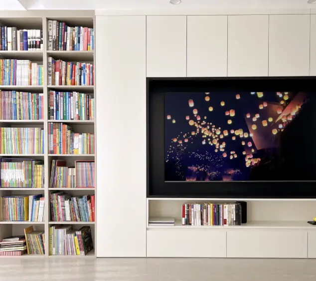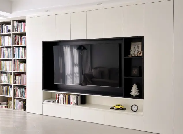 如果空间足够,做满墙电视柜+开放式书柜,既能收纳全家人的书籍,又能保持客厅整洁度。