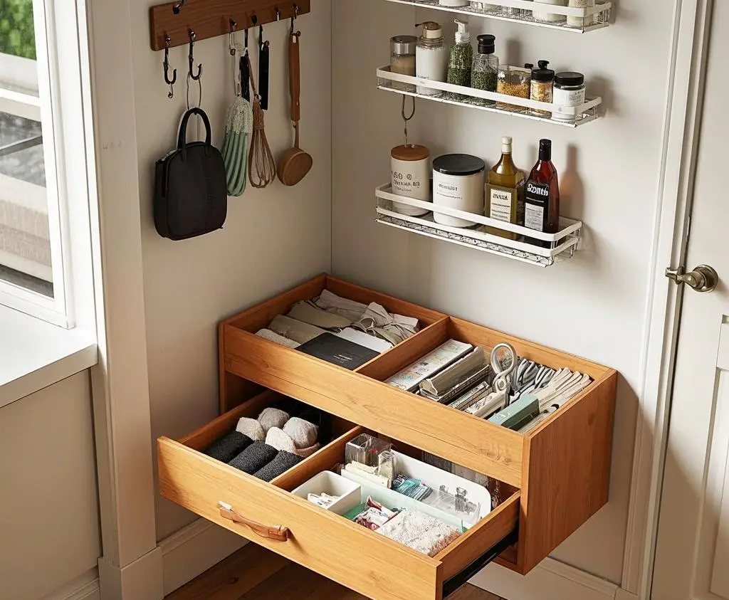 门后也是一个可以利用的收纳区域。在卧室门后、厨房门后、卫生间门后,可以安装门后挂钩或者门后收纳架。门后挂钩可以挂包包、外套、帽子等;门后收纳架可以放鞋子、清洁用品等。这样既不占用额外的空间,又能让物品摆放得井井有条。