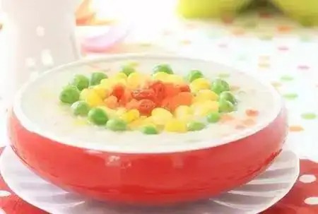 材料:10g枸杞子、20g豌豆、50g菠萝丁、15g胡萝卜、200g玉米粒、适量糖。