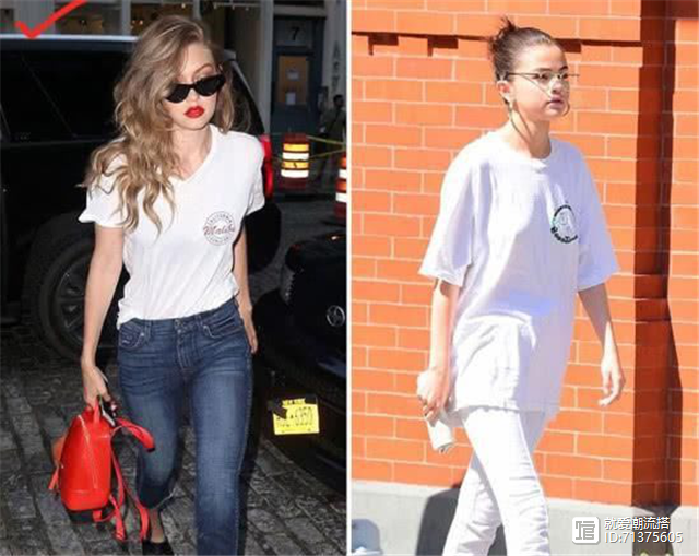 举个例子,下图中的两件T恤由于领口设计得不同,瞬间给人的气质和感觉也就不一样了,圆领的T恤就使得模特的整体气质看起来非常的拘谨,而V领则显得更加的有气场一些!