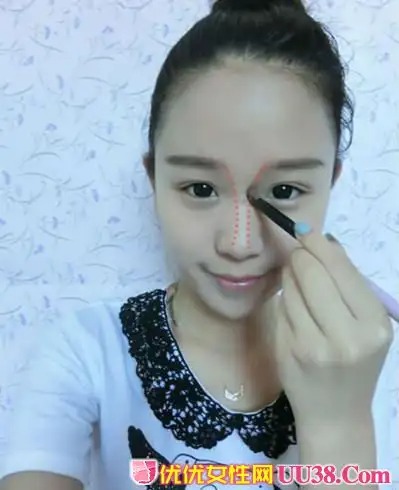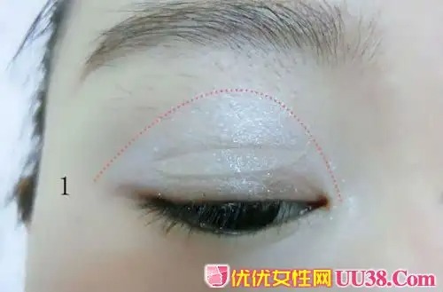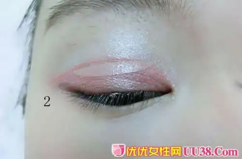 步骤七:再用刷子蘸取粉色的眼影刷在双眼皮褶皱的上面一点位置。#p#副标题#e#