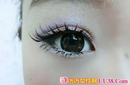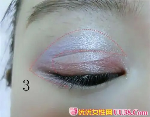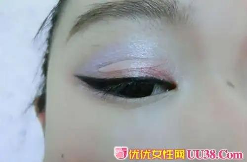 步骤八:接着用梳子蘸取淡紫色的眼影刷在红线的位置,下眼睑也要刷上。#p#副标题#e#