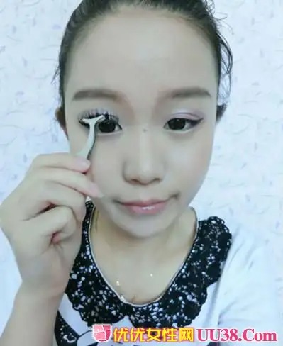 步骤十:接着开始眼睫毛的部分,选一款自然交叉的假睫毛,涂上胶水待半干后,从眼睛中间处开始粘贴。#p#副标题#e#