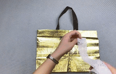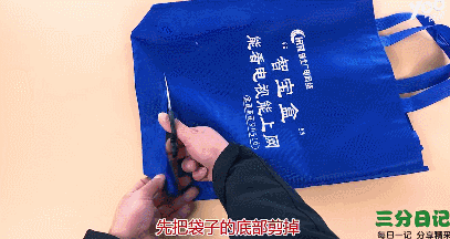 讲完了衣物收纳,接下里换种方式,将环保袋改造成工具收纳袋!找出一个合适的环保袋,剪开两边的缝合部分,再剪开下面的提手。