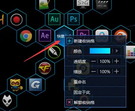 6、右击收纳格即可新建收纳格,或者修改颜色、透明度、尺寸、重命名、固定位置、解散收纳格等操作;