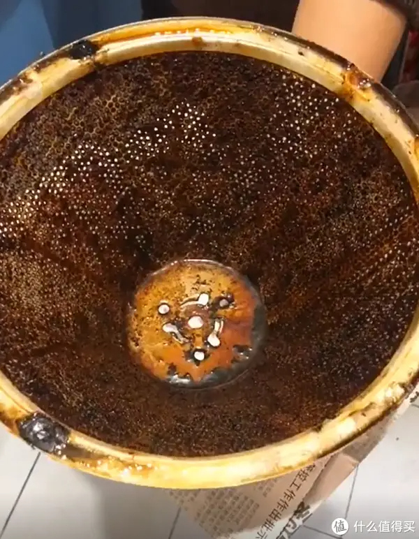 例如油烟机那个不锈钢网上面,用一两个月基本上就是不忍直视。这个方法在厨房任何油污都可以用这个方法——就是一个小苏打。