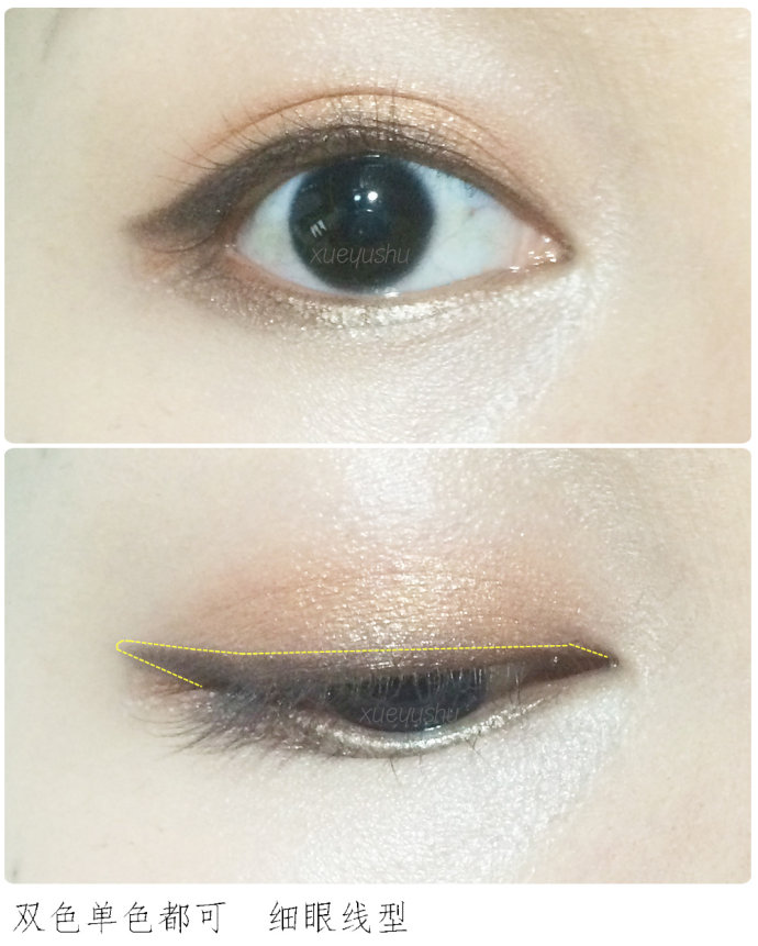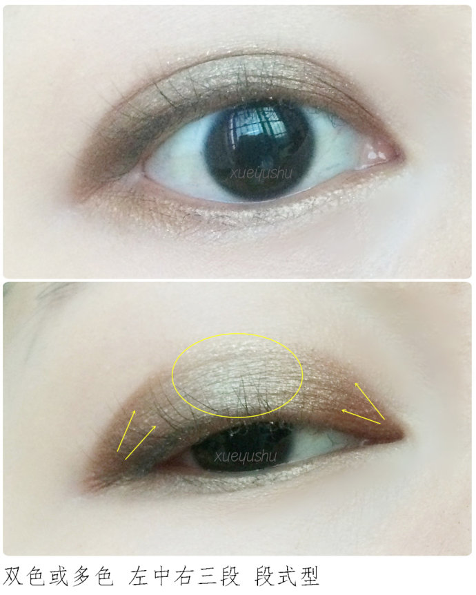 建议使用双色练习,段式型,中间浅色点缀,两边深色,更深邃立体,适合扁平五官,超放大眼睛。有两种画法:1.深色平均平涂眼皮,再用浅色闪烁的眼影点缀在眼中。如果不够深邃,可补补两头深色。2.浅色点缀眼中,再用深色眼影在两头往中靠拢,如果浅色不够闪烁可补补色。切记,这类型的浅色一定要够明显或够闪烁。