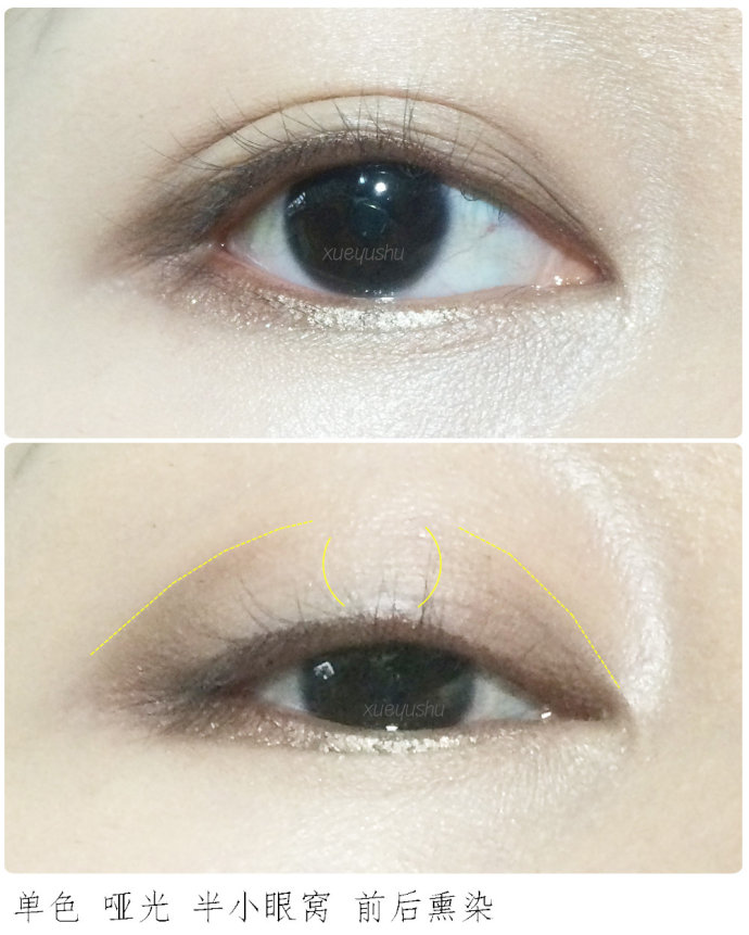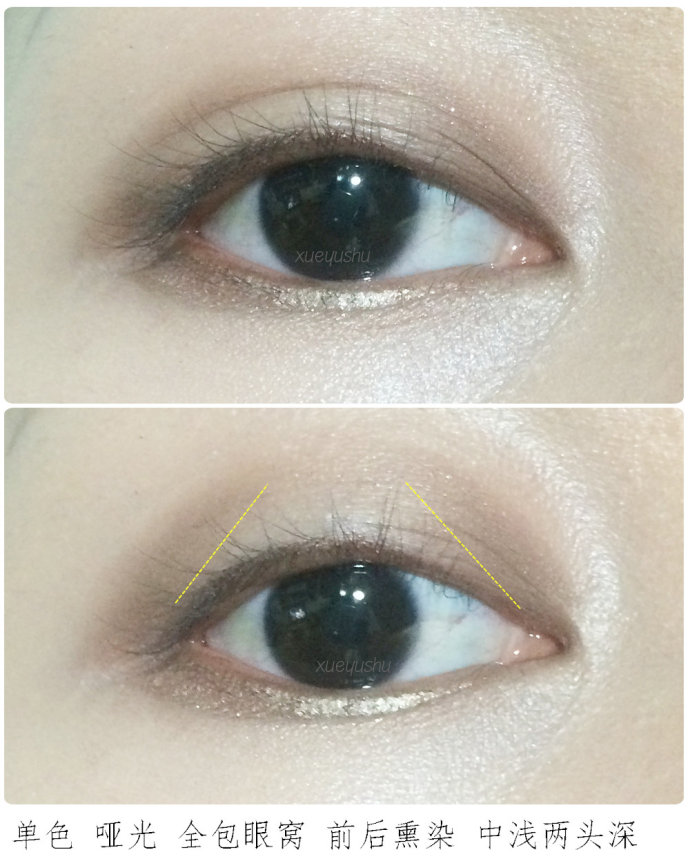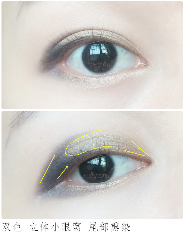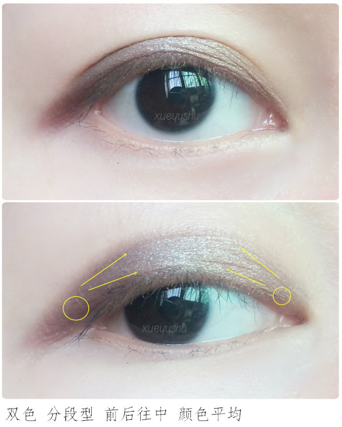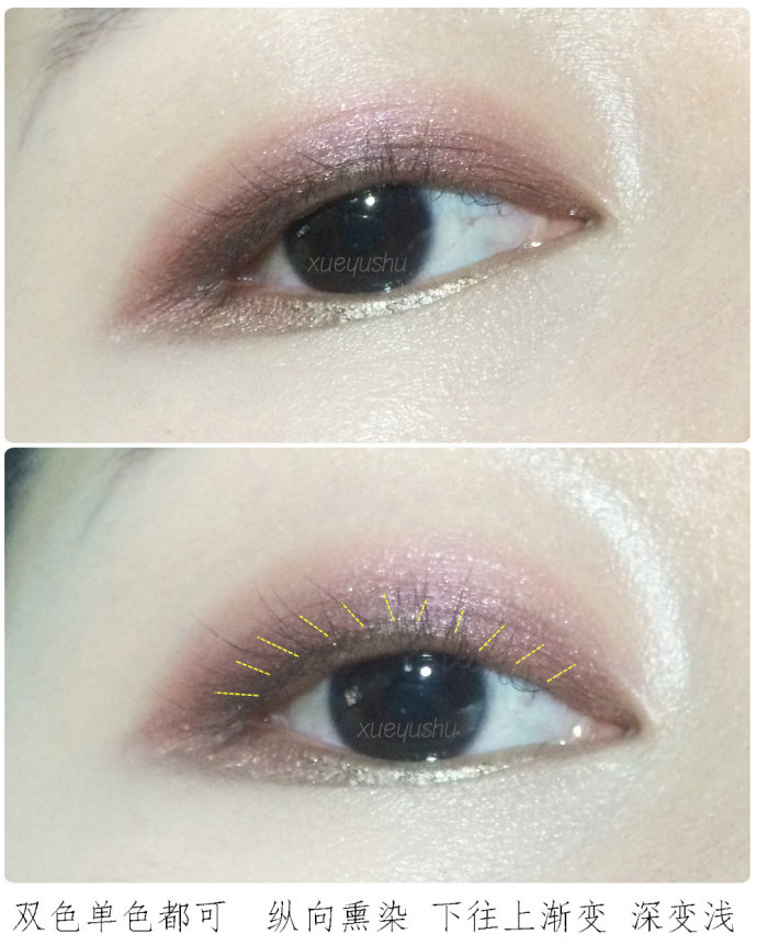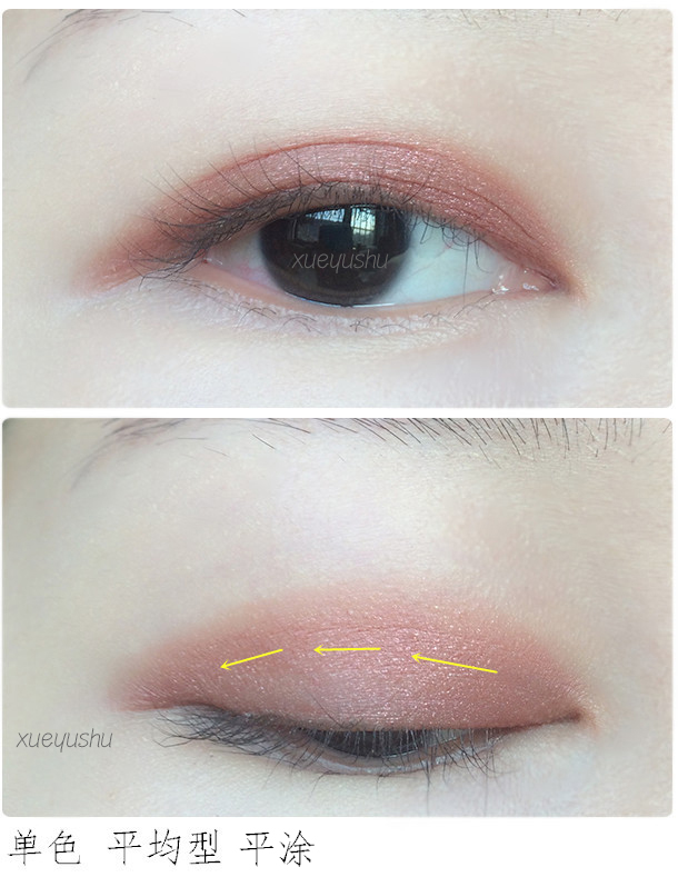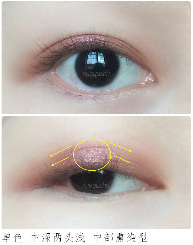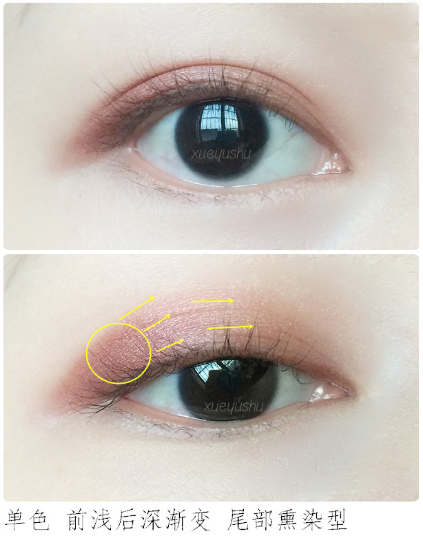 选择单色或双色都可,建议使用深浅的双色练习比较快速。纵向熏染也就是低往上渐变,适合小眼睛/内双窄眼皮/单眼皮,