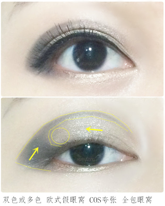 (假眼窝图1忘记画内眼线了,所以略显奇怪,建议夸张眼影还是要画足眼线和搭配浓密的假睫毛)假装画出外国人深邃眼窝,黑色加深邃眼窝处要在眼窝最凹部位,双色眼窝是最简单,也是最‘假’的,使用的颜色越多,打造越立体,越有外国人深眼窝感,相信美术生能操控更多色的描绘。