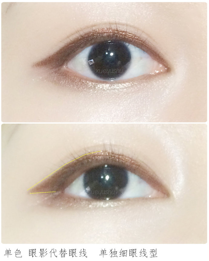 用眼影代替眼线画法也是非常简单,而且能够多变化。适合不懂得画眼线的新手可以使用眼影来练习,建议一直都学不会画眼线的妹子可以用眼影练习。如果出门在外眼线脱了,只有深色眼影可以代替补妆使用。不适合耸塌眼皮和臃肿泡眼。