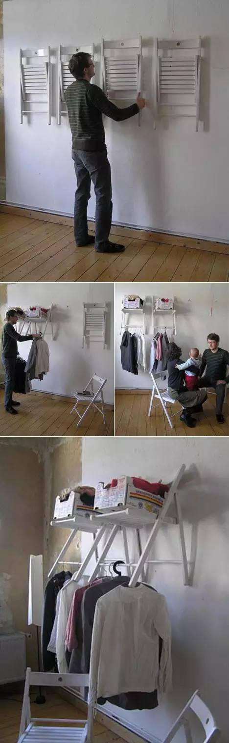 折叠椅子上墙去,拿下来是椅子,挂上去是架子。