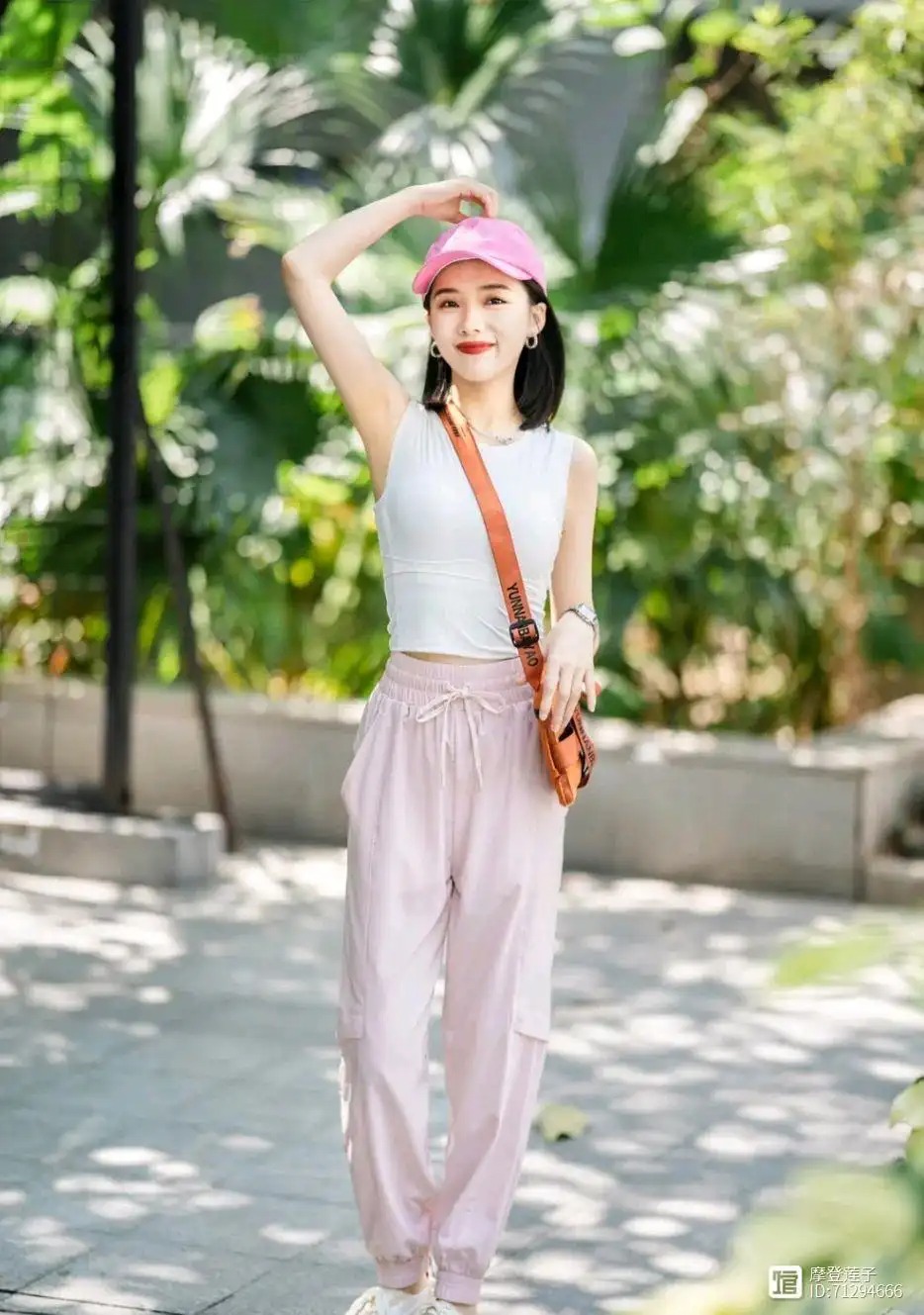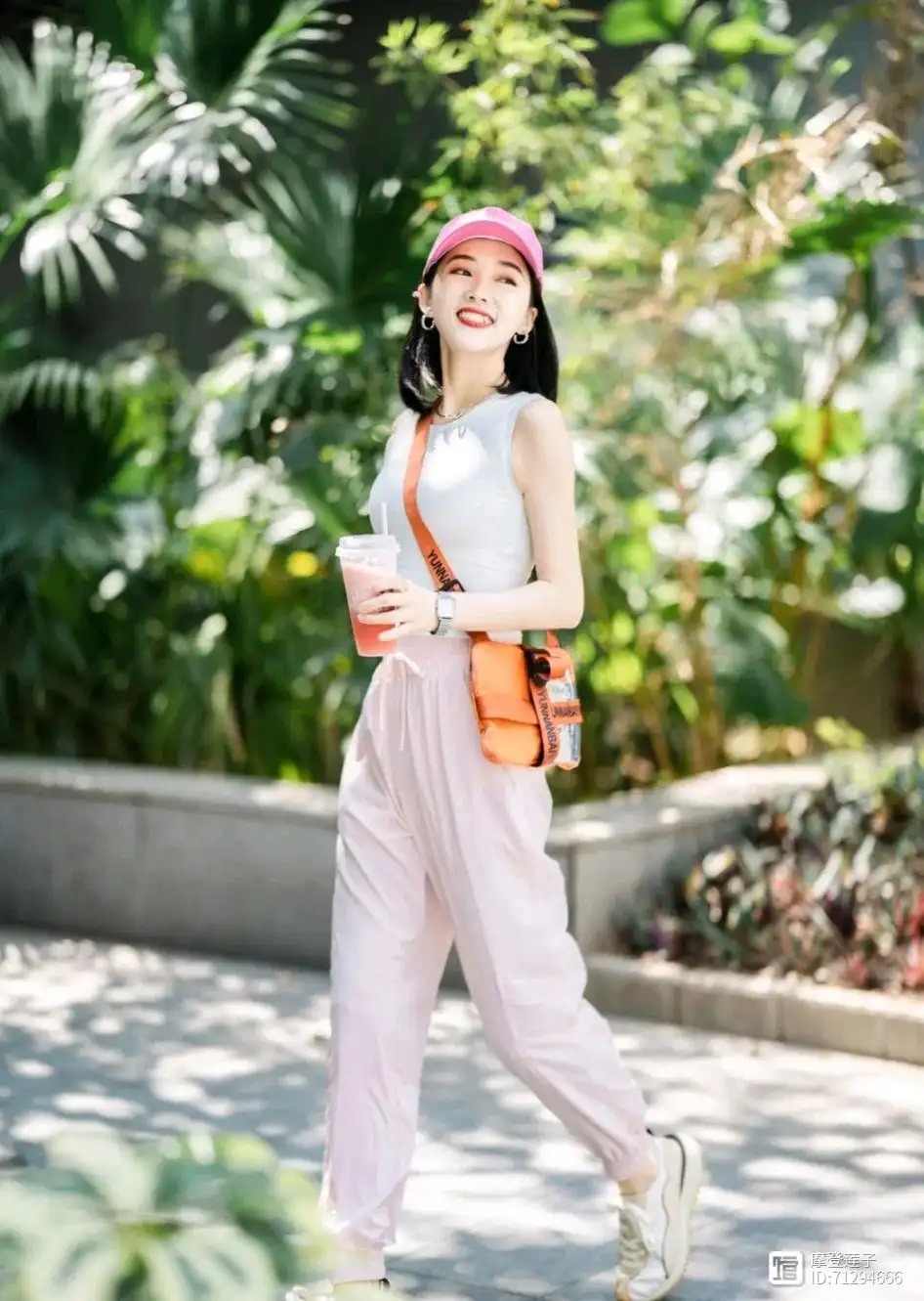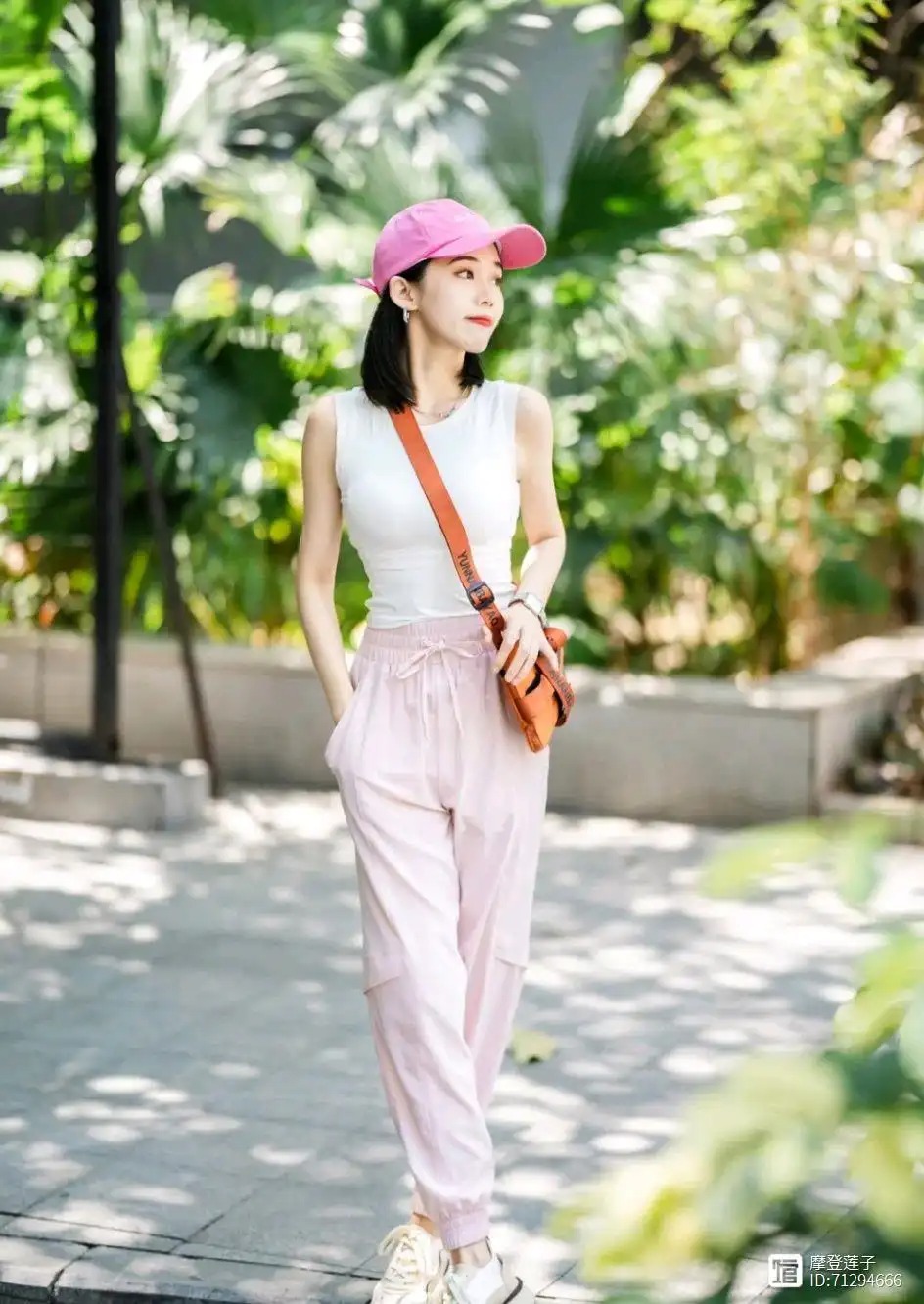 日常穿搭所选择的服装要以简约大气为主,因为太过复杂的话,不太好驾驭,也不太好搭配,甚至有可能没办法把自身的魅力呈现出来,可以借鉴一下这位时尚博主的穿搭风格,她选择了简简单单的白色小背心搭配粉色休闲裤,穿出来的视觉效果减龄又耐看。