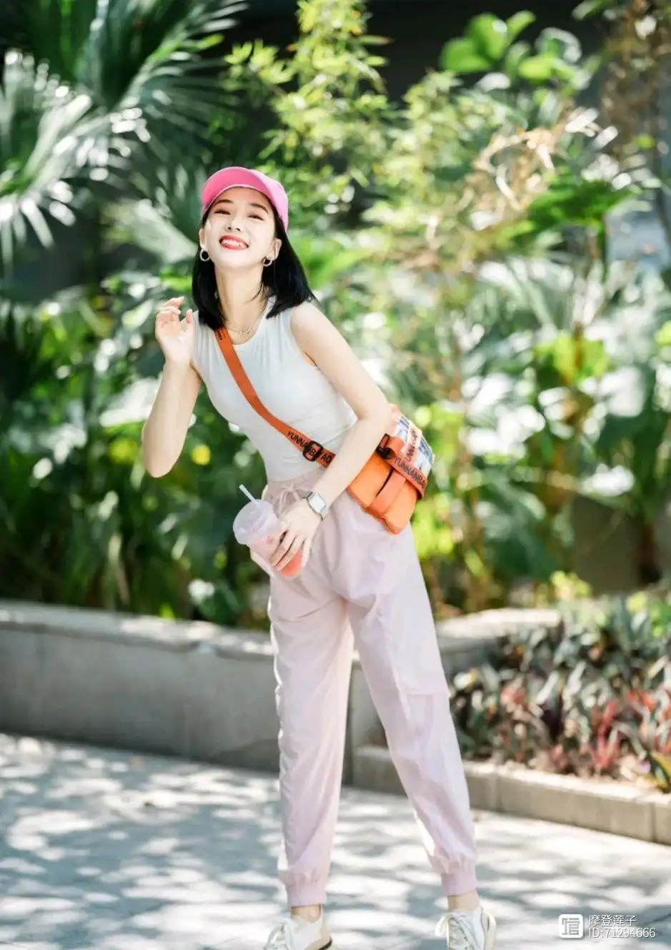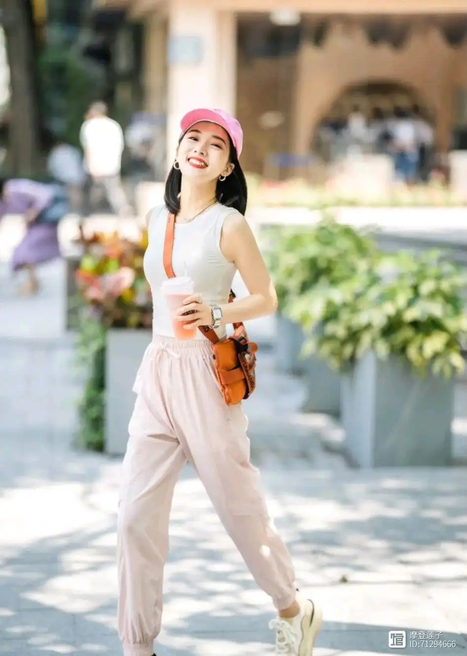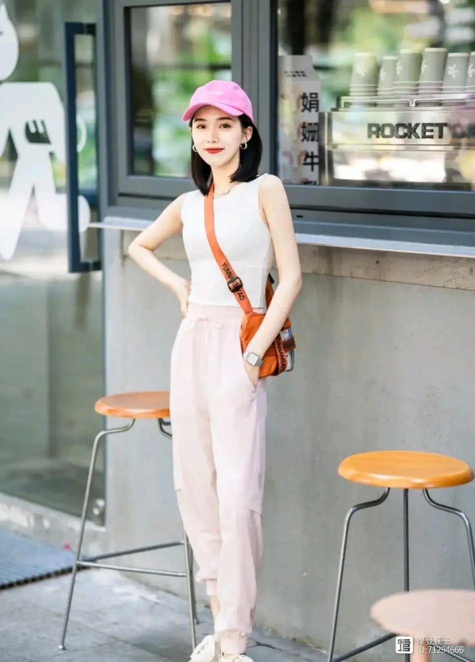 日常穿搭所选择的服装要以简约大气为主,因为太过复杂的话,不太好驾驭,也不太好搭配,甚至有可能没办法把自身的魅力呈现出来,可以借鉴一下这位时尚博主的穿搭风格,她选择了简简单单的白色小背心搭配粉色休闲裤,穿出来的视觉效果减龄又耐看。