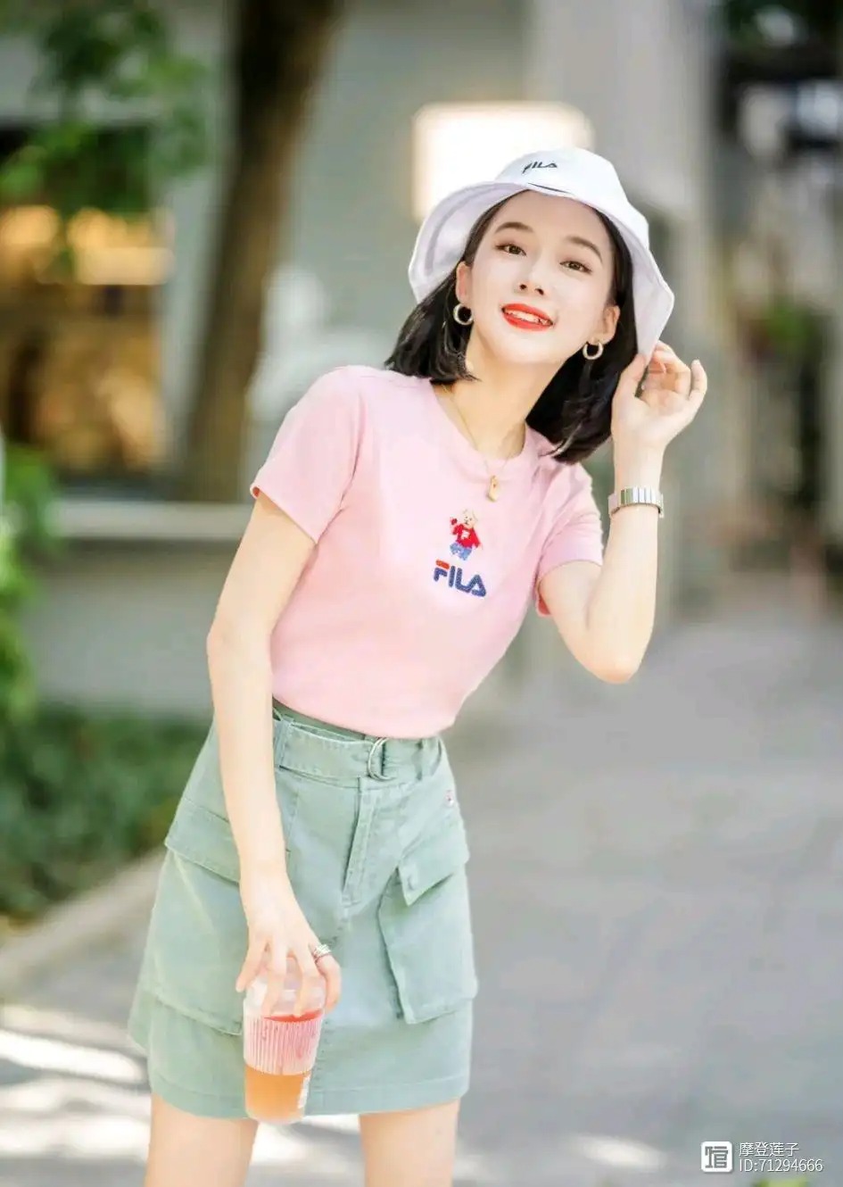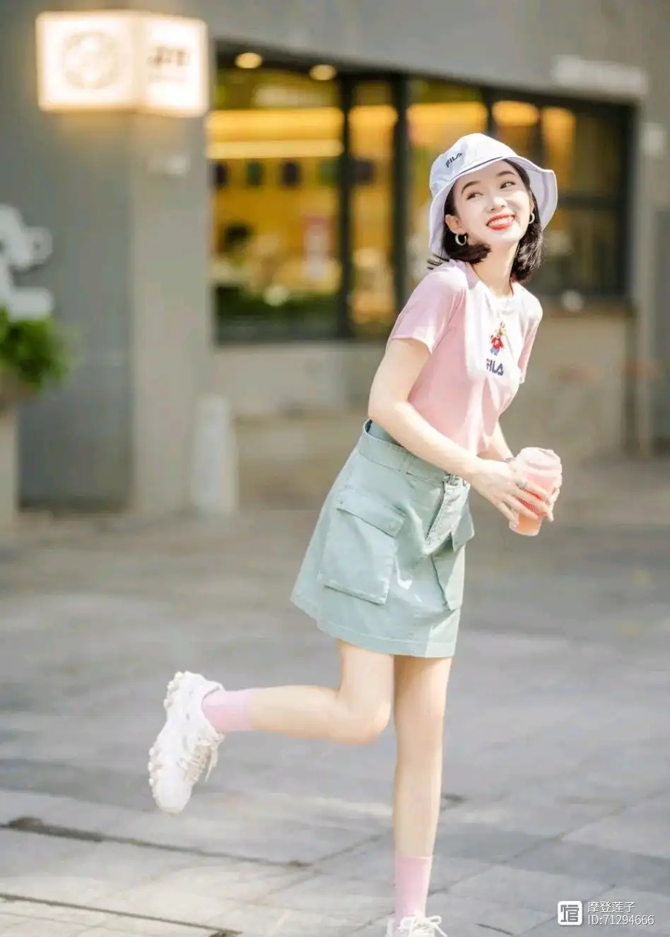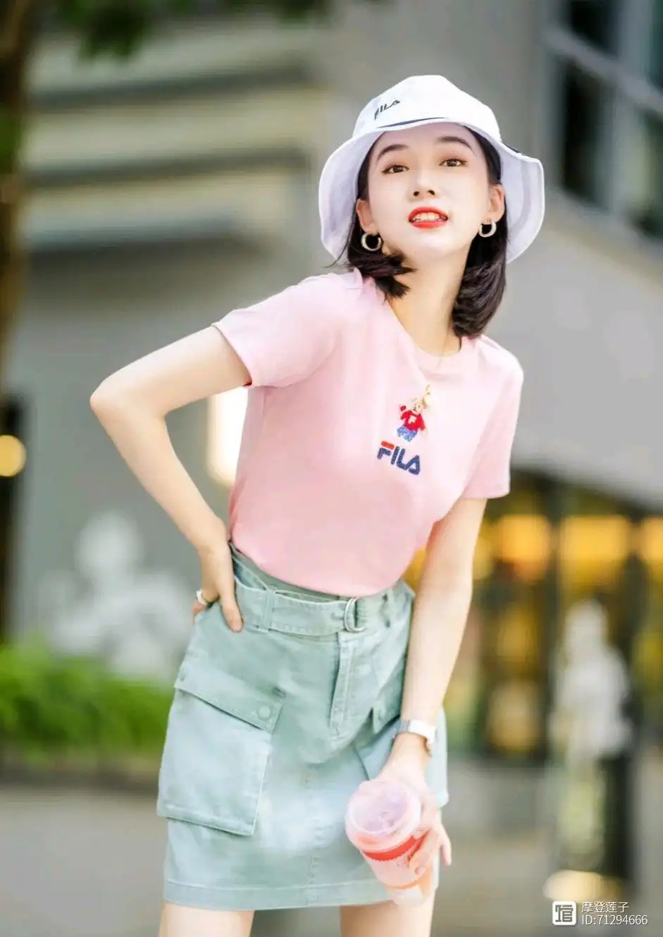 不知道怎么搭配的女生可以借鉴一下这位时尚博主的穿搭风格,她选择了浅粉色T恤搭配浅蓝色牛仔短裙,穿出来的视觉效果既甜美又耐看,轻松起到减龄的作用。