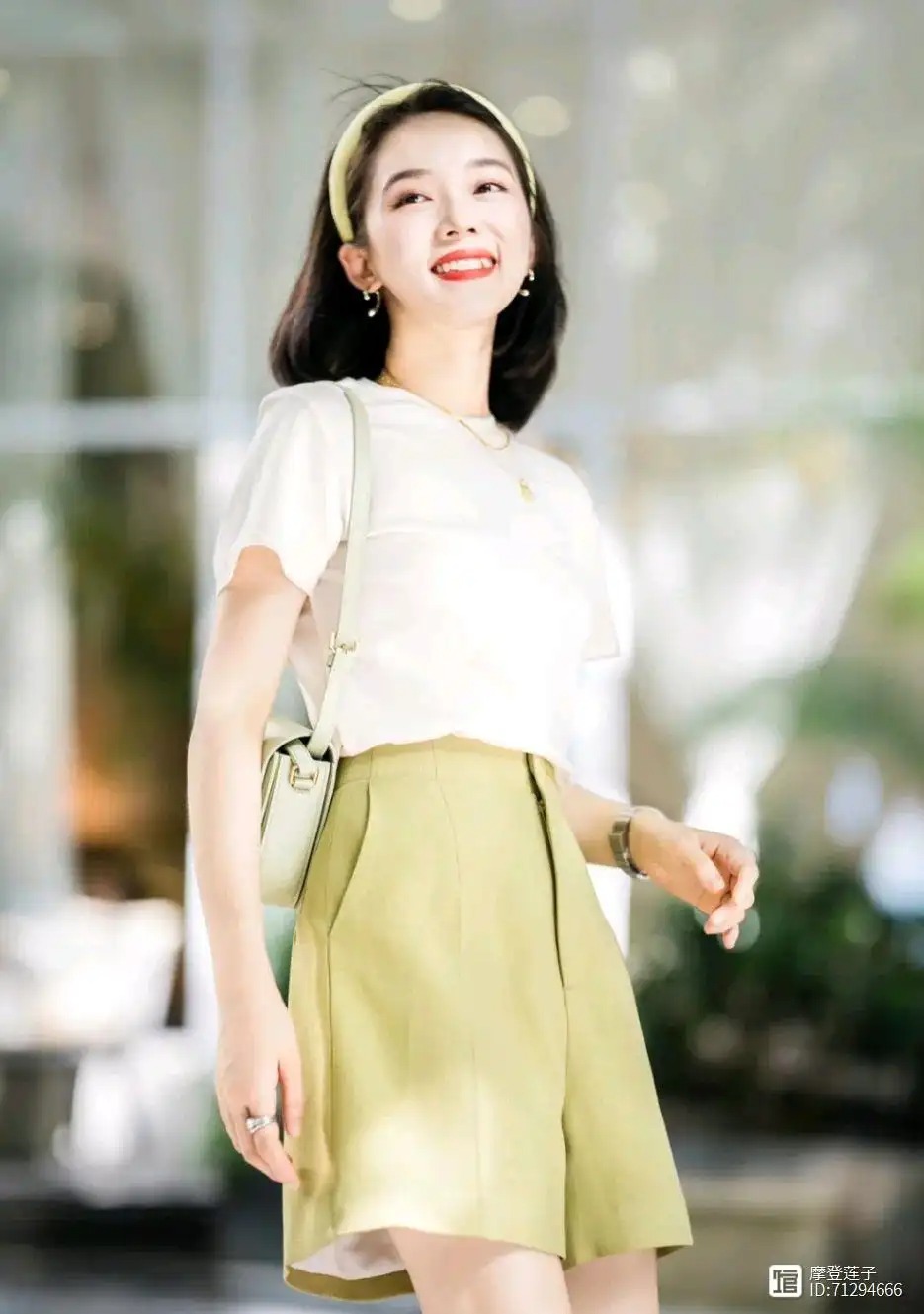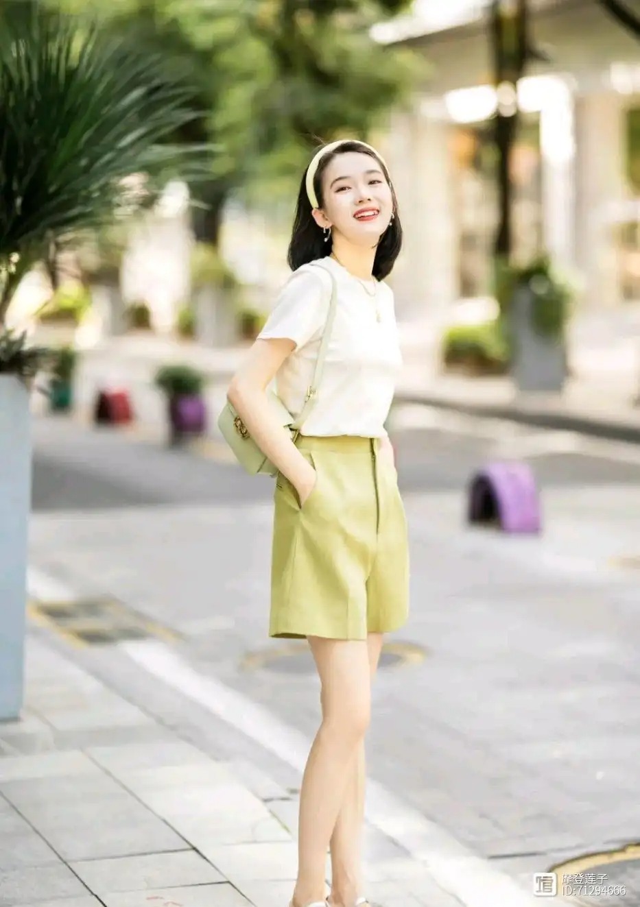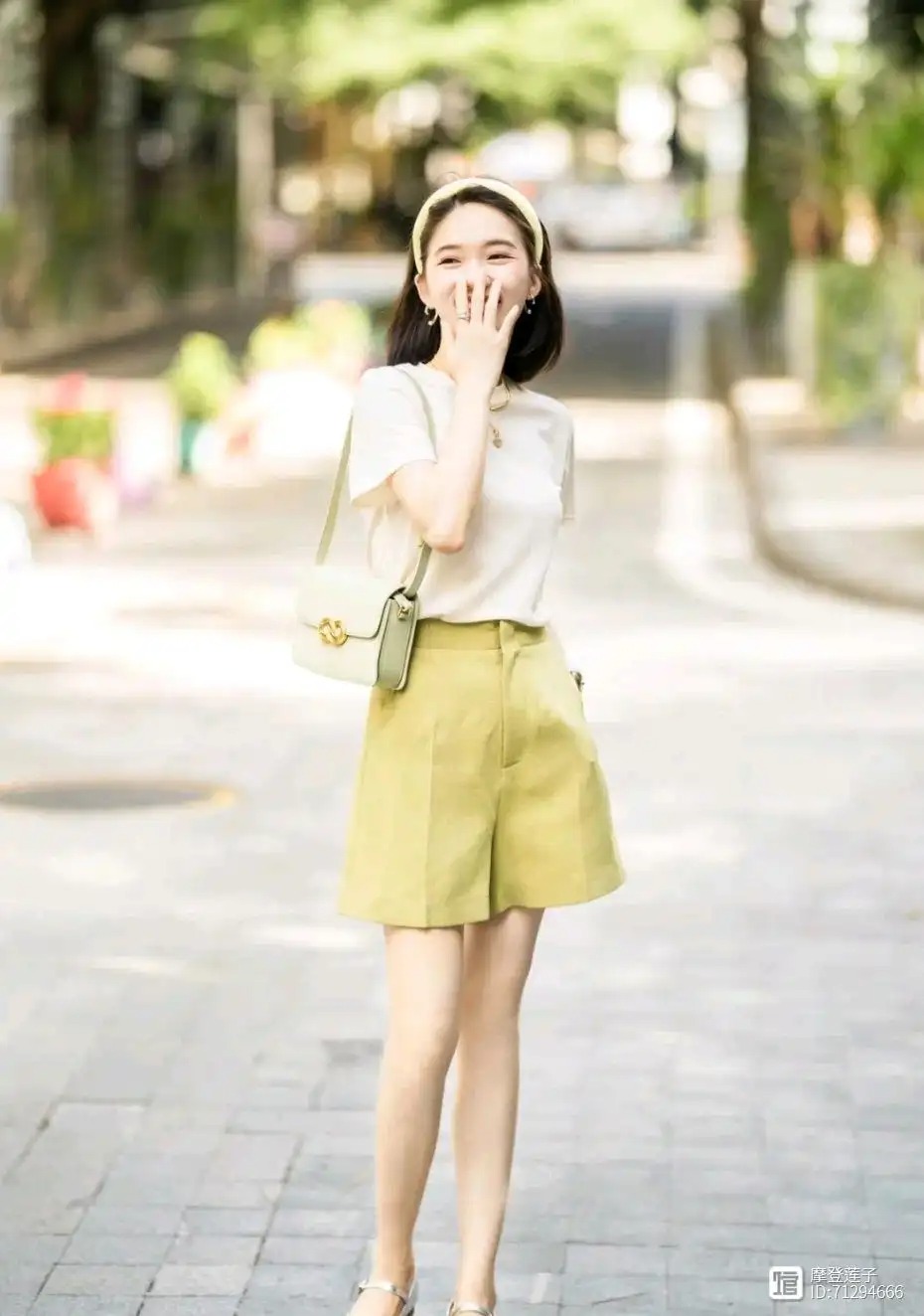 不知道怎么搭配的女生可以借鉴一下这位时尚博主的穿搭风格,她选择了简简单单的白色T恤搭配浅黄色半截裤,穿出了清清爽爽的感觉,很轻松就能起到减龄的作用。