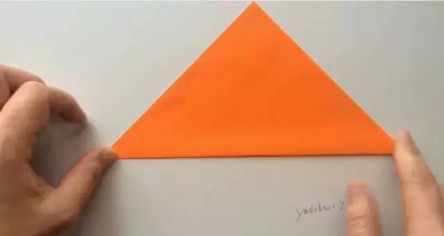 首先把橙色卡纸对折两次,都是对折成等腰三角形哦