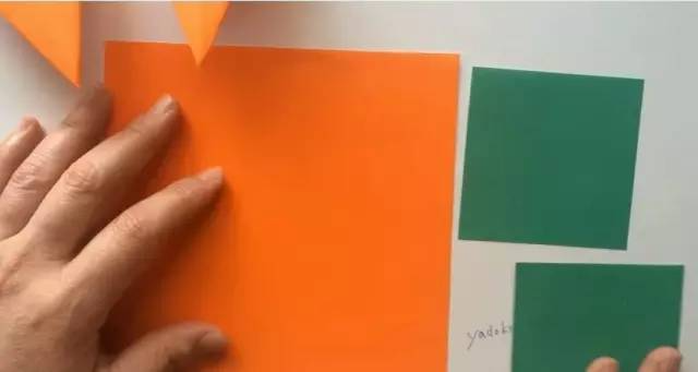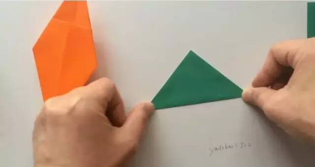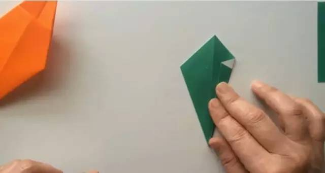 然后我们拿两张小的绿色正方形彩纸来折胡萝卜的茎和叶子,先把一张对折成三角形