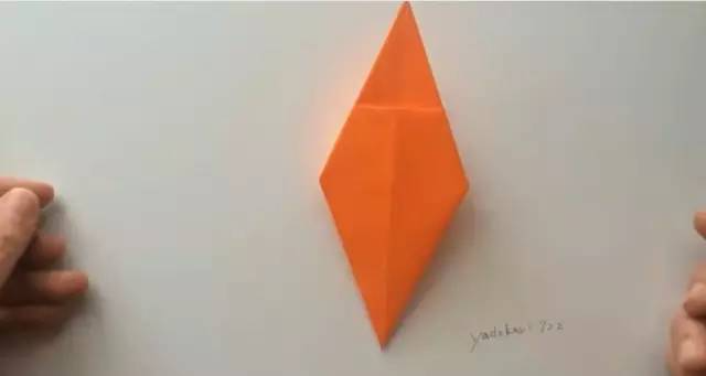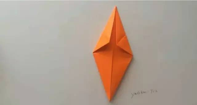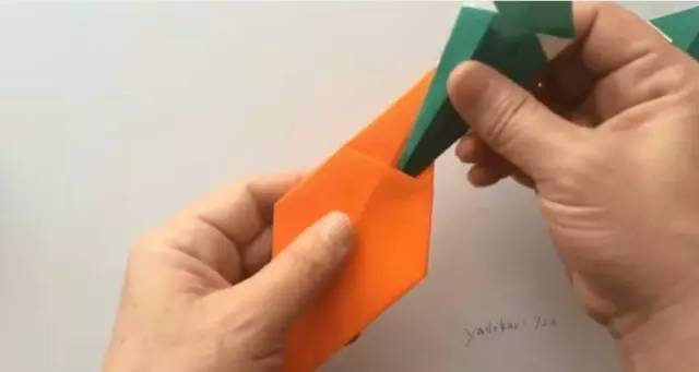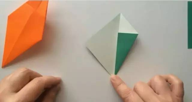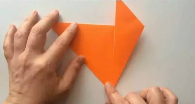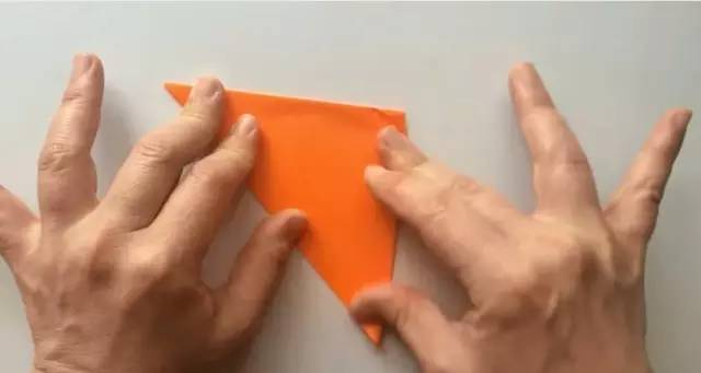 现在把左右两边的角也折到中间,这样胡萝卜橙色的身体就做好了,我们把它翻过来备用