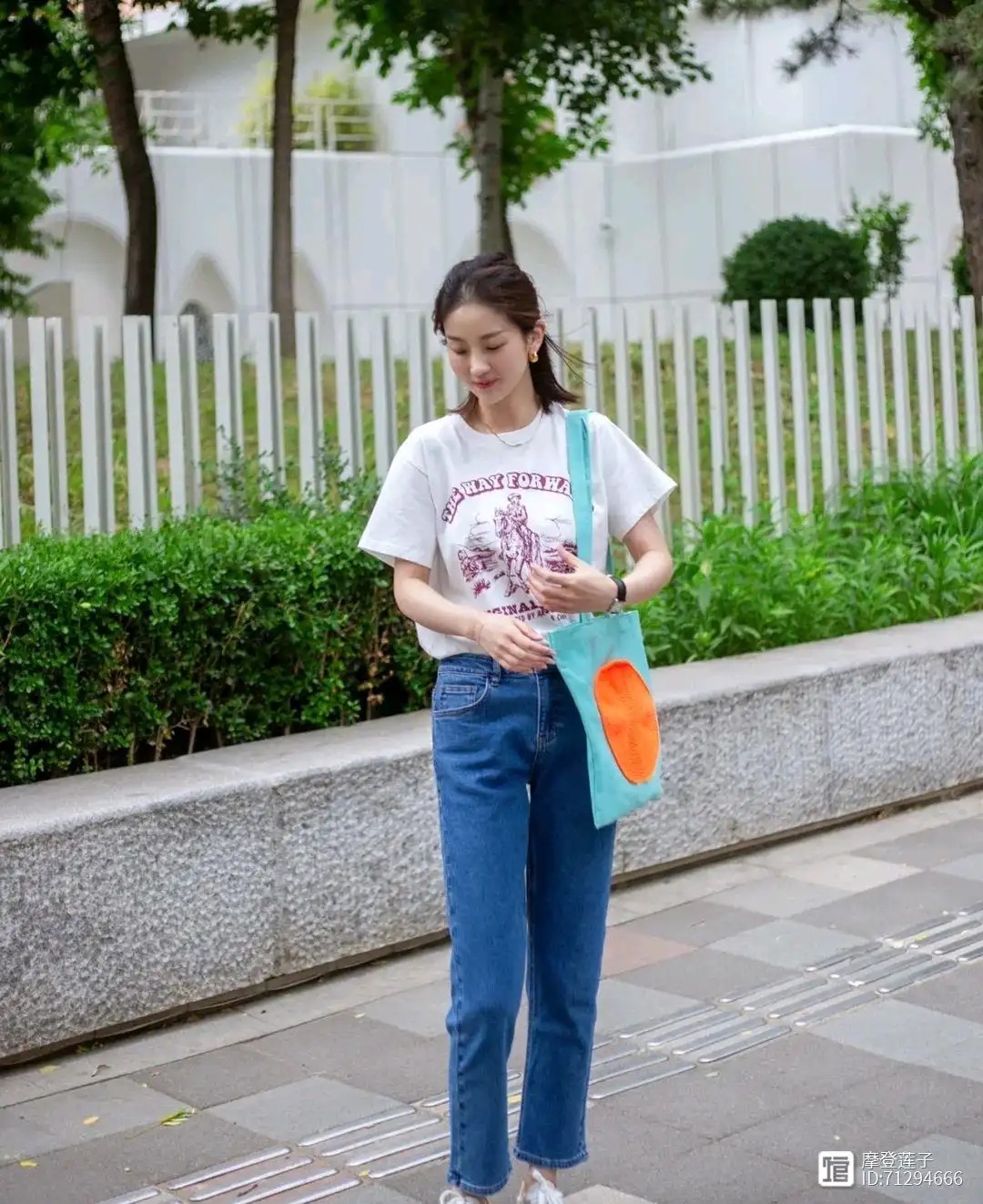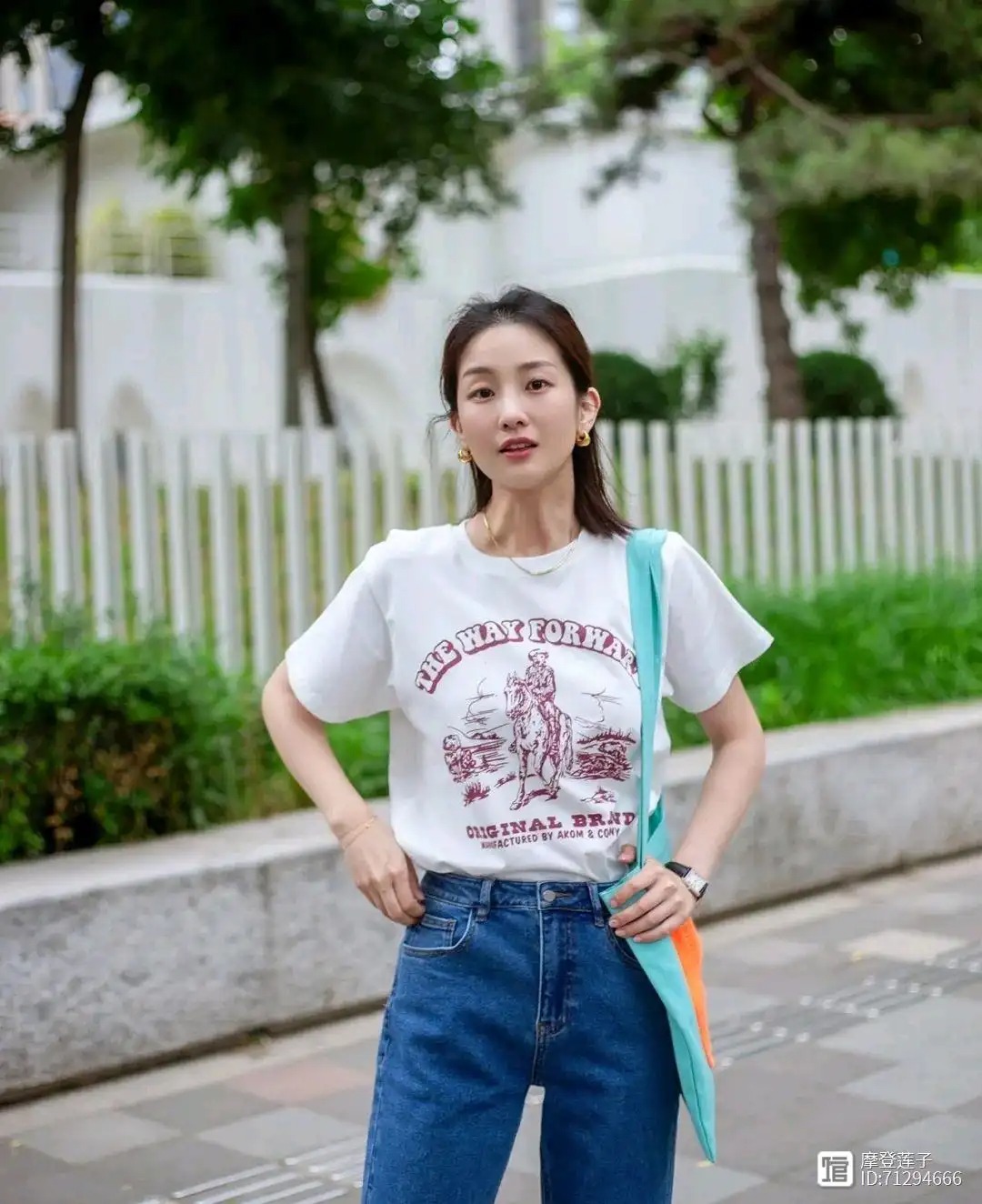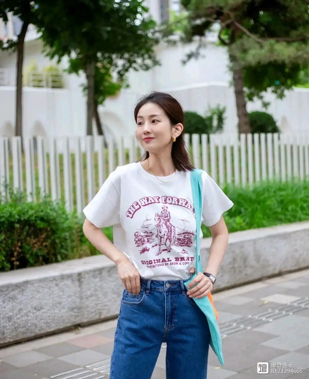 T恤搭配牛仔裤就是很不错的选择,可以说是很常见的搭配方式,对大部分女生来讲都很友好,也许看上去显得有点普通,却能轻松穿出减龄的效果。
