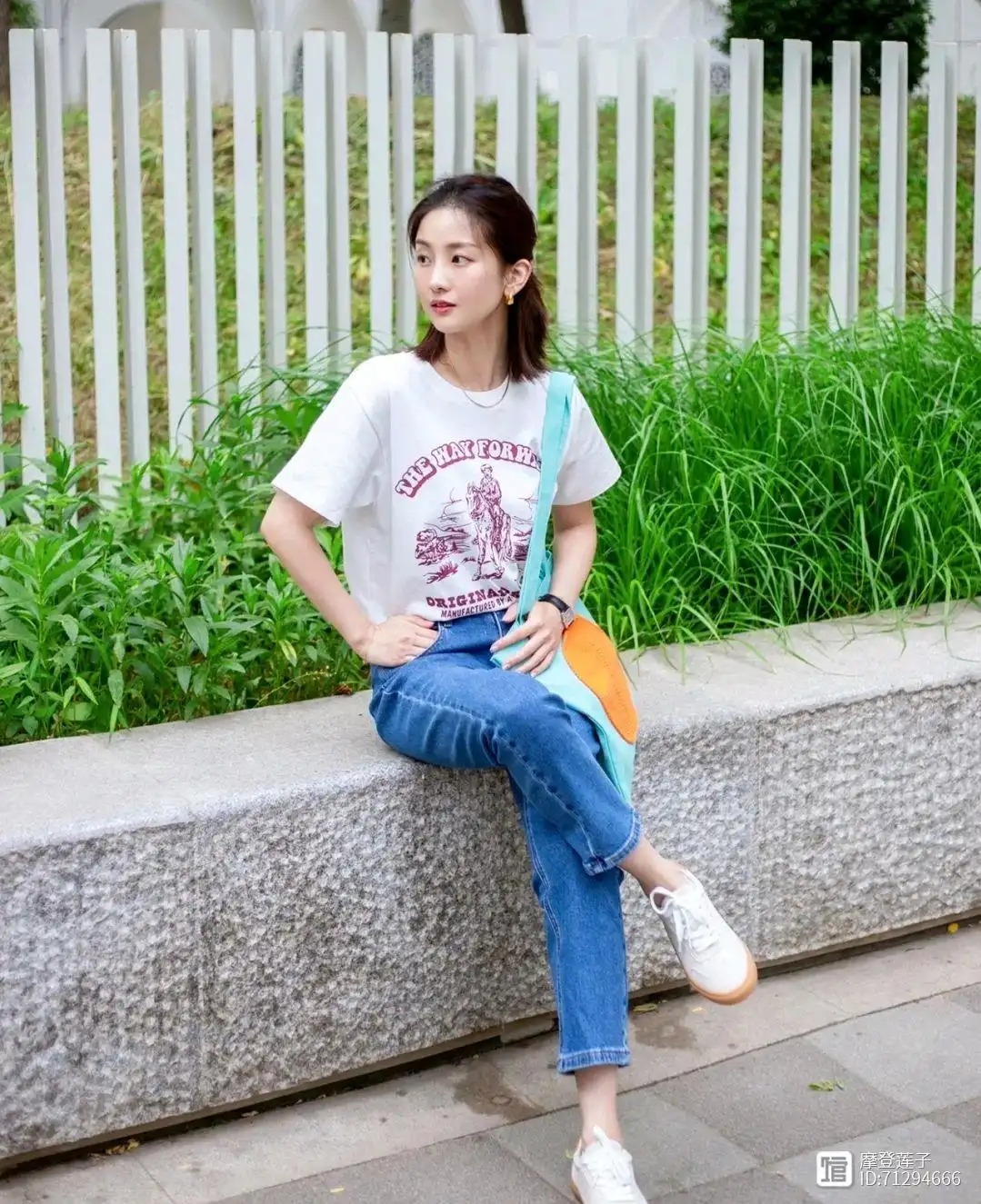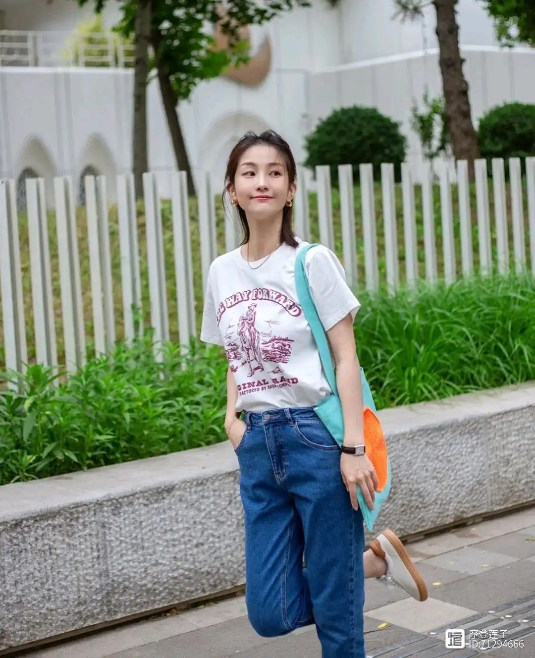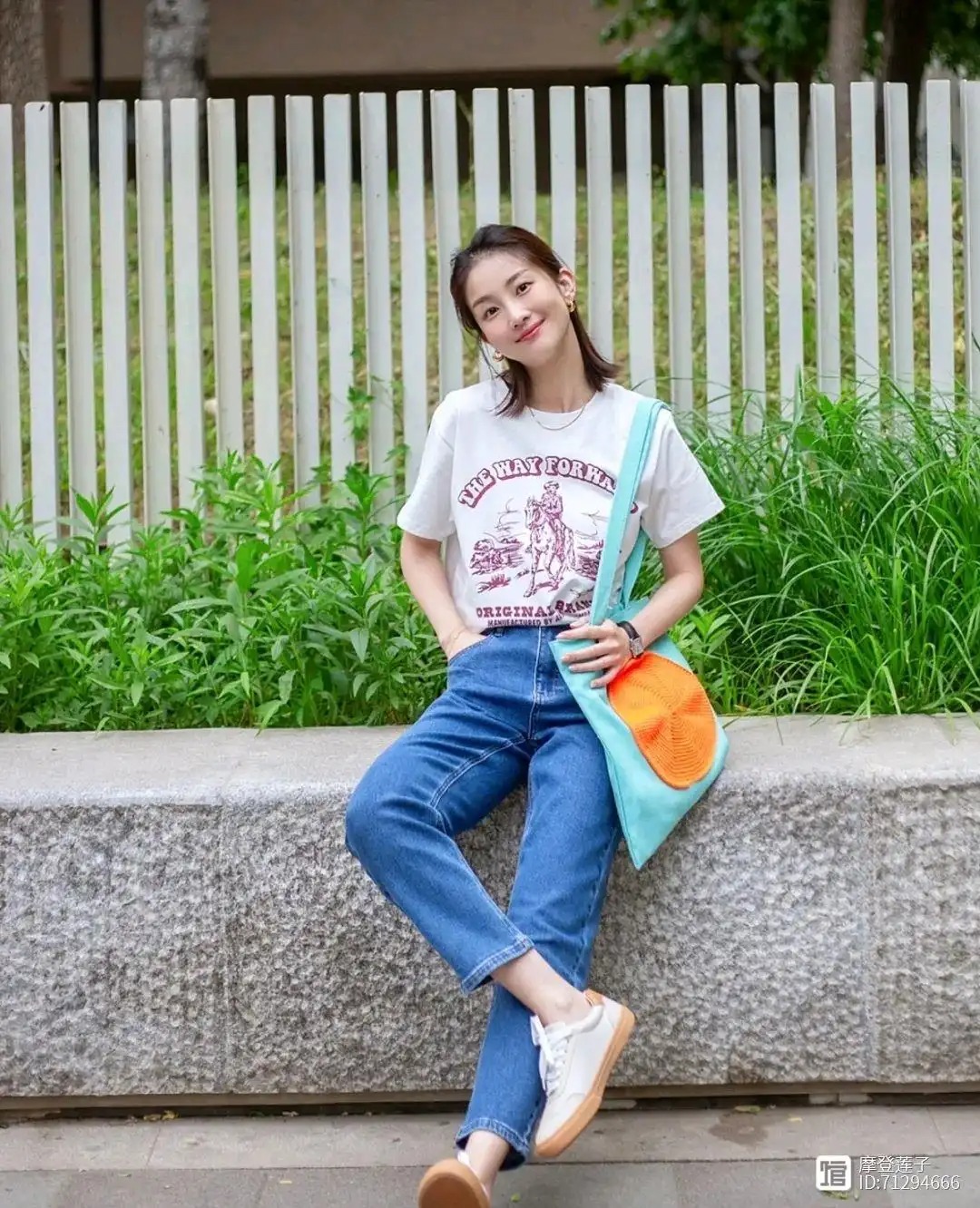 T恤搭配牛仔裤就是很不错的选择,可以说是很常见的搭配方式,对大部分女生来讲都很友好,也许看上去显得有点普通,却能轻松穿出减龄的效果。