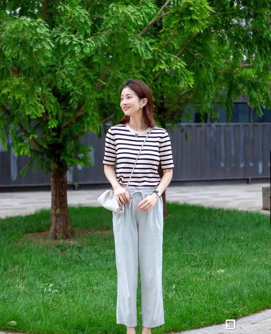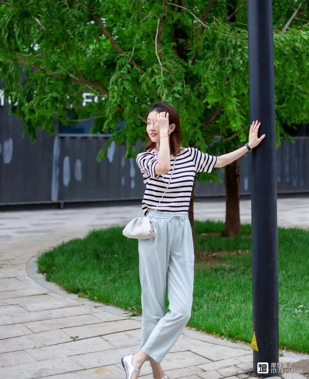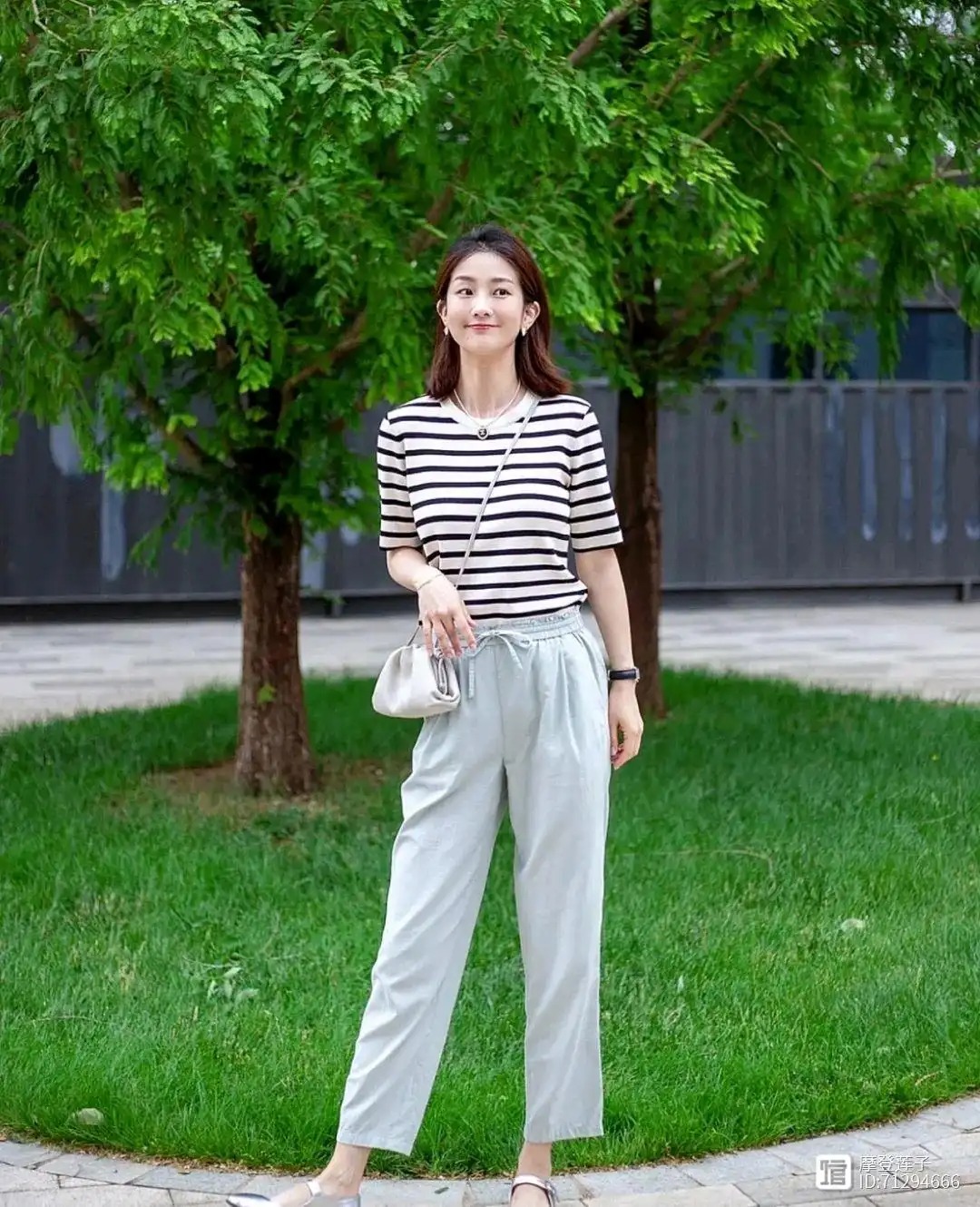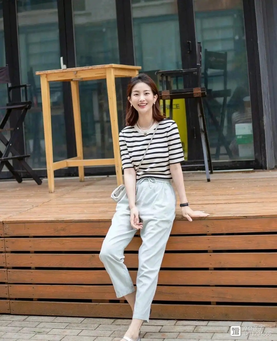 这位时尚博主所穿的这套服装就很值得女生们借鉴,她选择了黑白相间的条纹T恤搭配浅色休闲裤,穿出来的视觉效果干净利落。