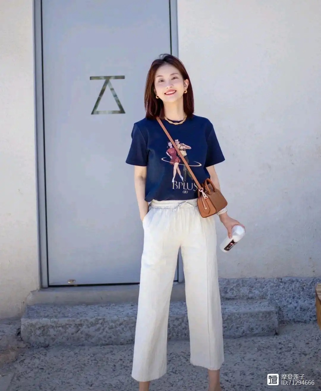这位时尚博主所穿的这套服装就很简单,她选择了颜色偏深的蓝色T恤搭配浅色休闲裤,穿出来的视觉效果即显瘦又耐看,而且还不会觉得沉闷。