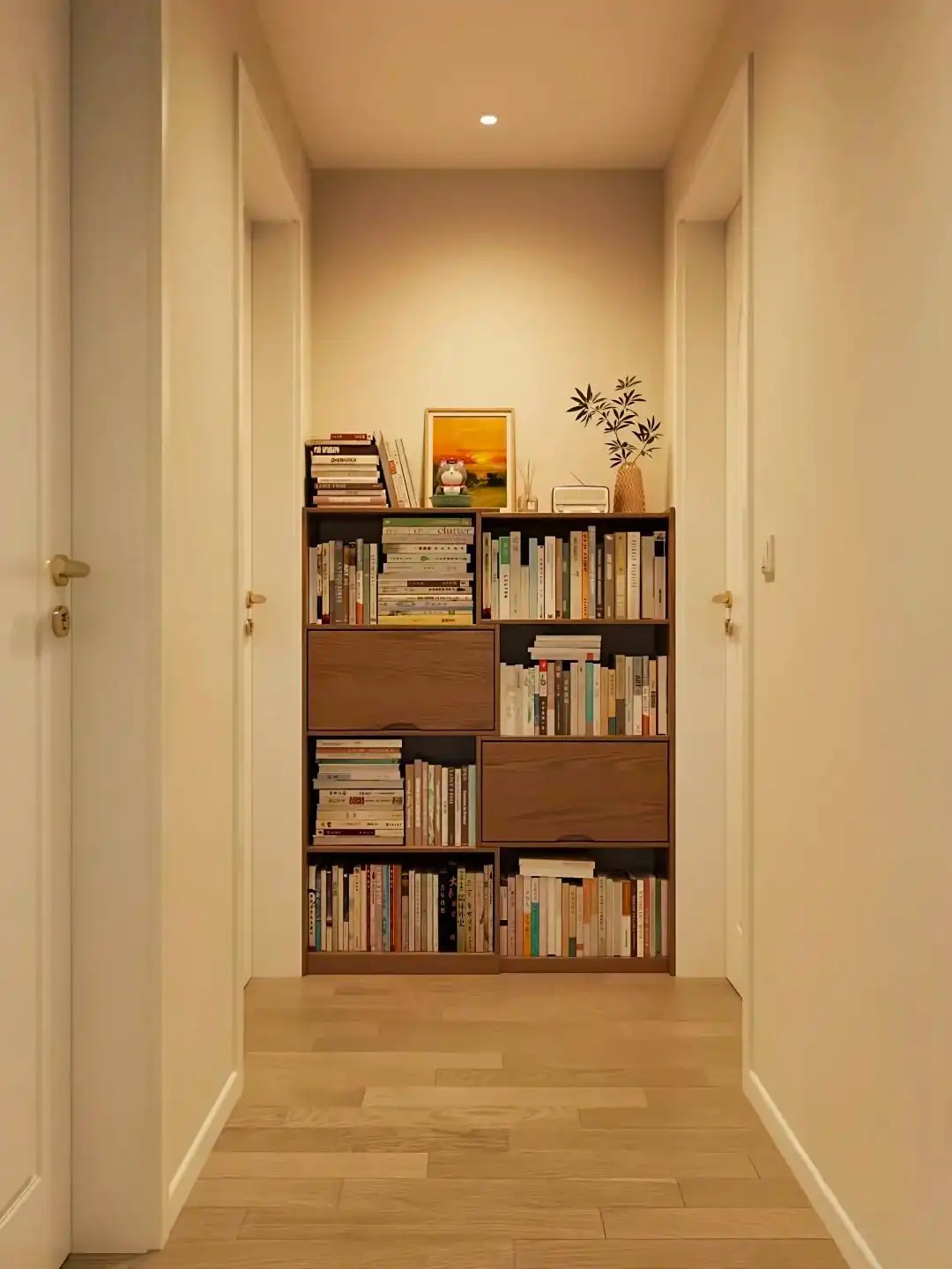 比如,我们可以在走廊的尽头安个小书柜,然后把书放在这里,这样既能满足我们想展示书香气息的小心愿,又不至于多占用一寸宝贵空间。