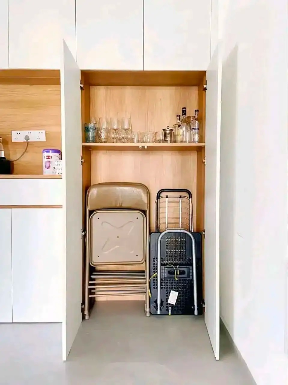 需要注意的是,如果要考虑椅子凳子的收纳问题的话,收纳柜的尺寸还是得根据我们家凳子的大小来定。如果我们家的凳子是个“大胖子”的话,空间最好留大点。