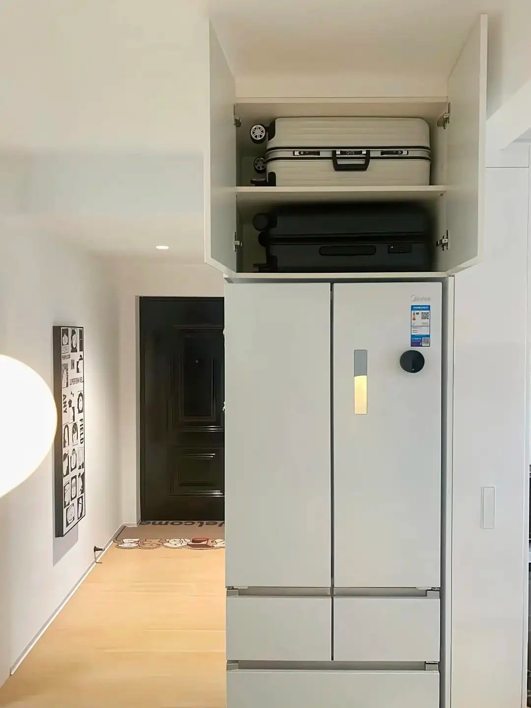 我们还可以把冰箱上方的空地拿来做成了隔板柜,直接把行李箱收进去,这样不浪费任何一个角落,整个家就能要把收纳做到极致。
