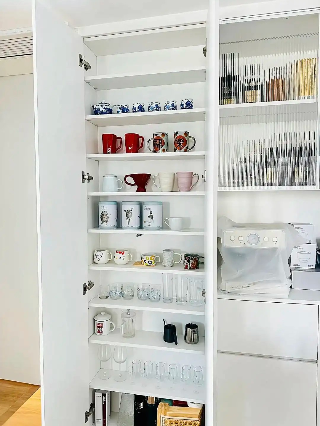 比如网友@欢欢,她就是个典型的杯子迷。在装修的时候,正好厨房那边有个柱子,她灵机一动,决定弄个窄柜,把她那些心爱的杯子都给安置进去。而且她把柜子全部设计成活动层板,这样可以随时调整高低,简直是杯子的“VIP级”入住空间。