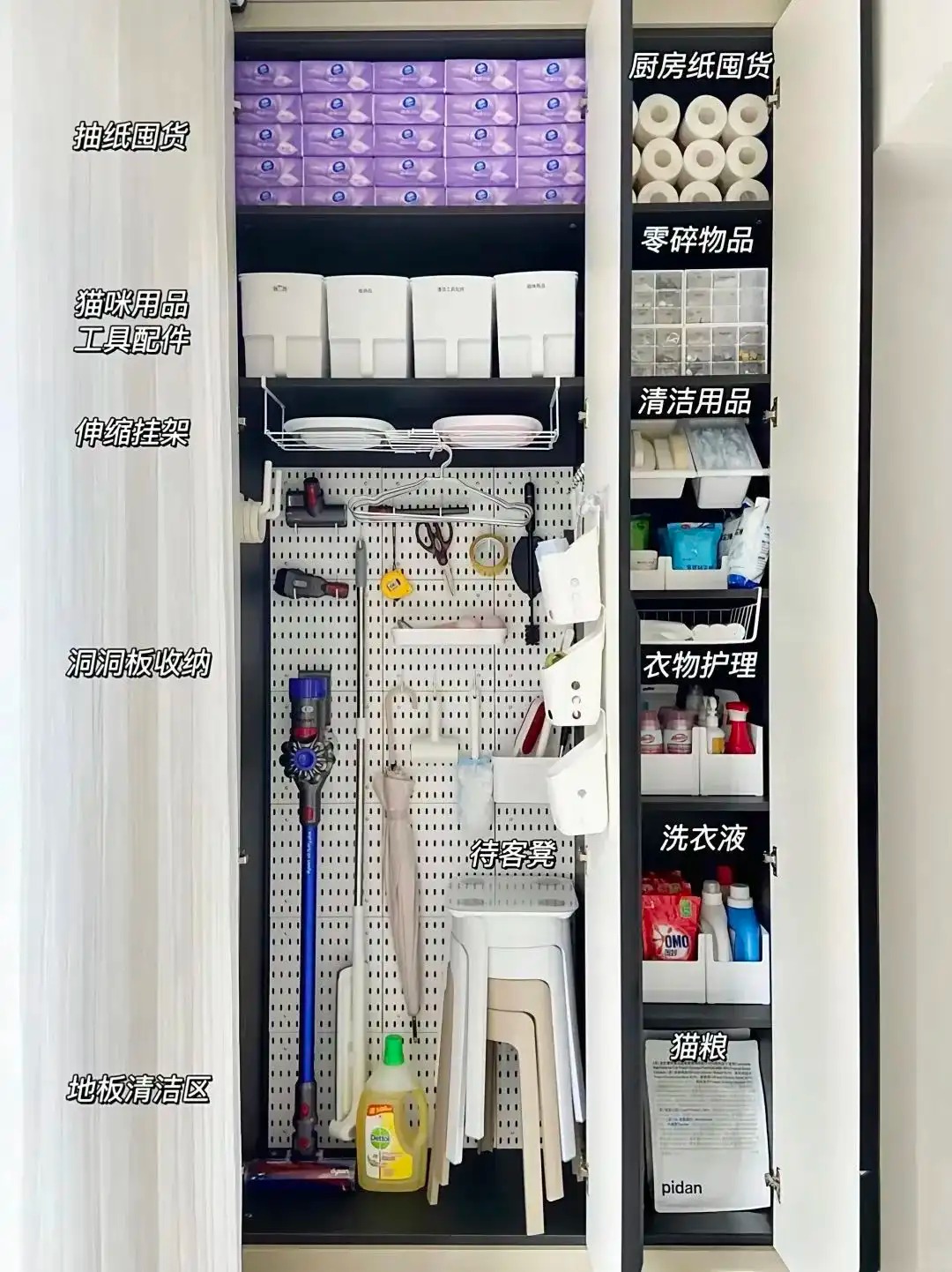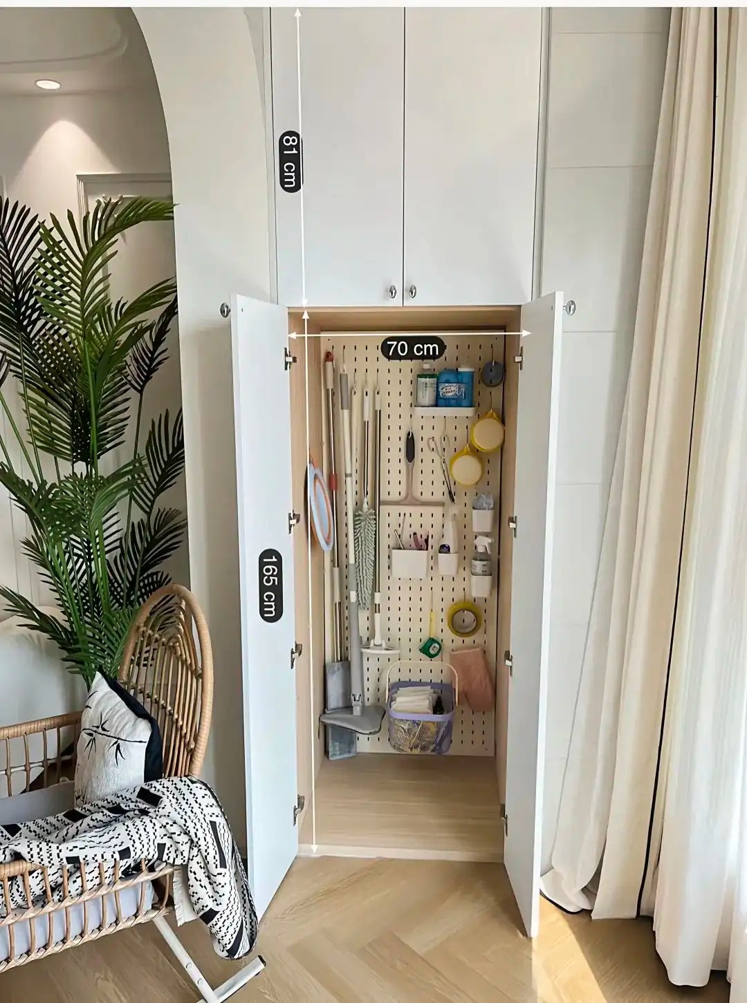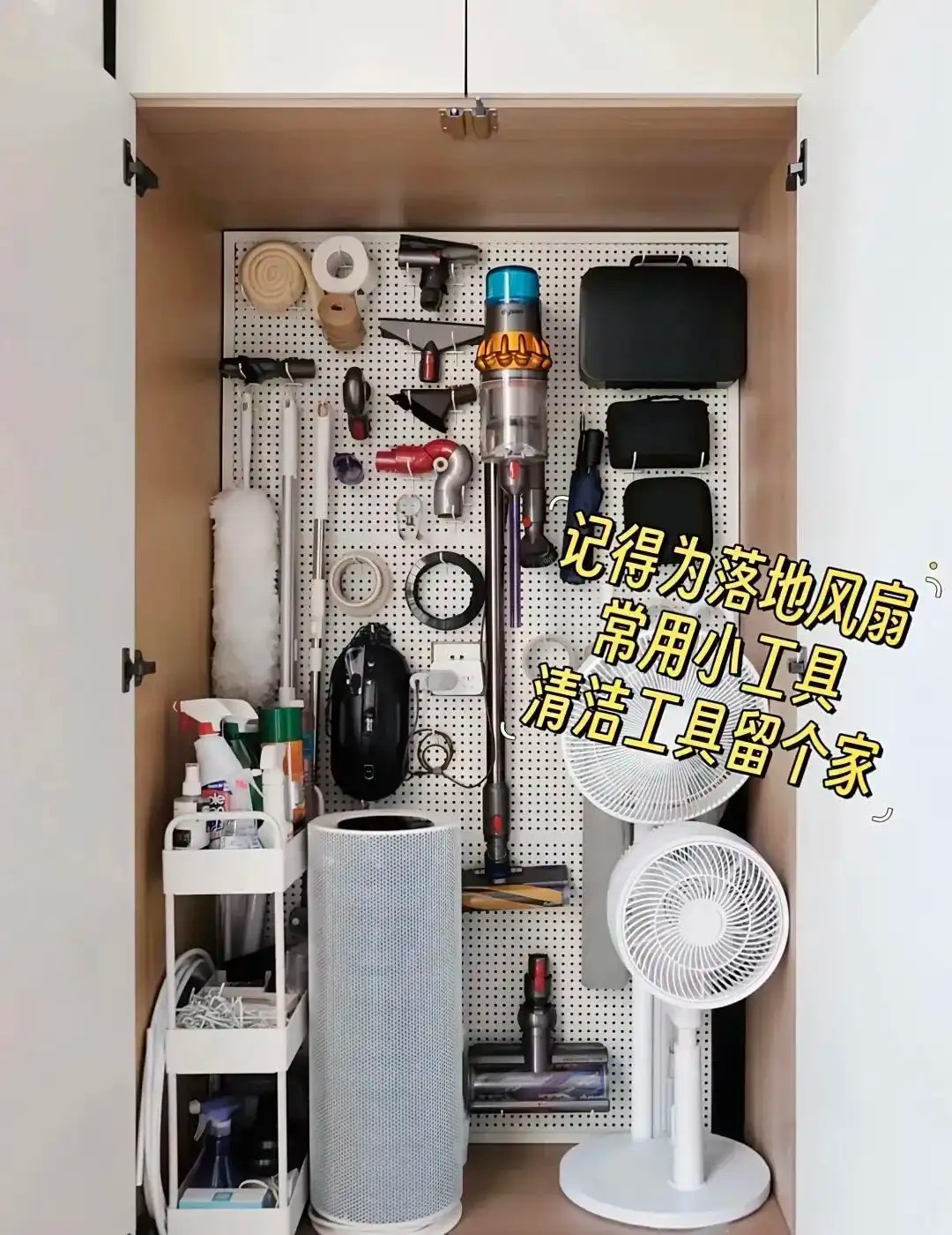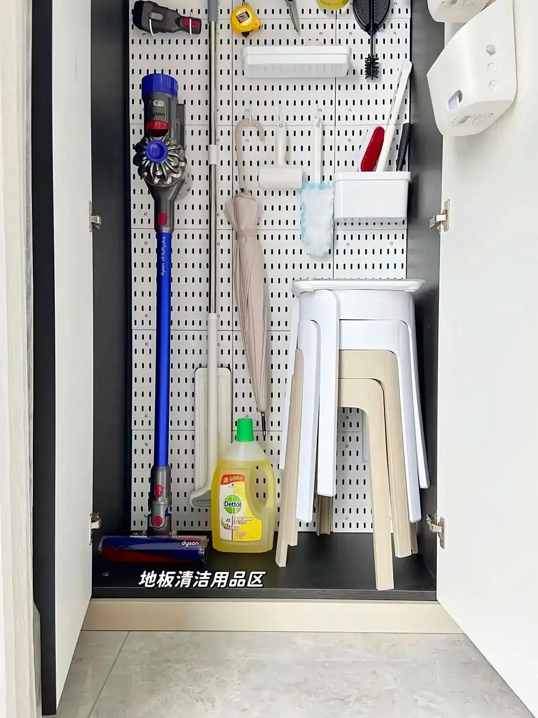 很多人都会选择在阳台柜里腾出一片“净土”,在里面安装洞洞板,这样吸尘器的各类零部件、除尘掸、小型清洁神器甚至电风扇,都能被收纳得井井有条,既整洁又颜值在线。