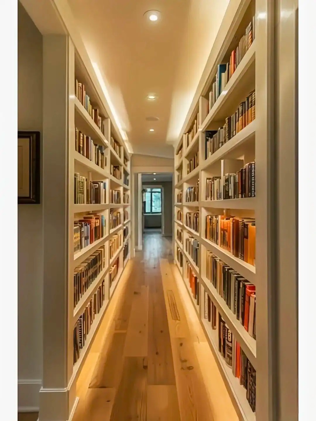 再比如,如果我们家的走廊够长的话,还可以直接在墙面上“掏个洞”,打造一个藏书的“秘密基地”,这样拿取方便又不失颜值,还能让整个空间都看起来有种“书香四溢”的优雅。