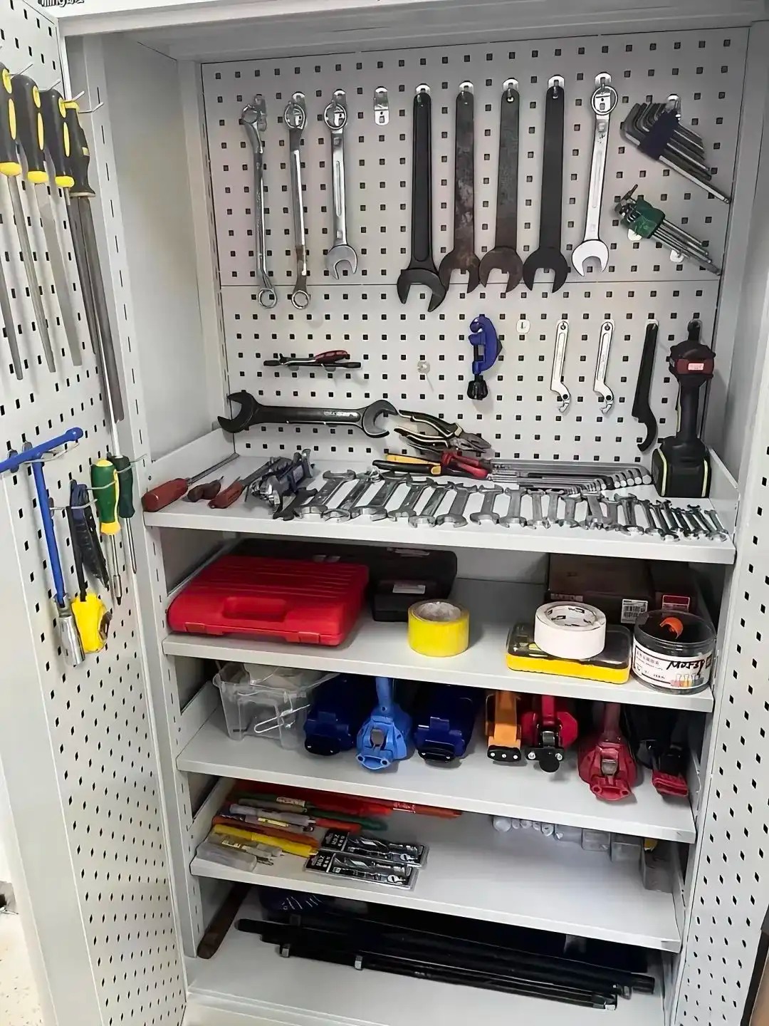 当然,最牛逼的操作,还是把柜子和洞洞板搭配起来,不仅超方便拿取,还能避免灰尘来袭,而且,这样工具永远都是亮闪闪的,完美!